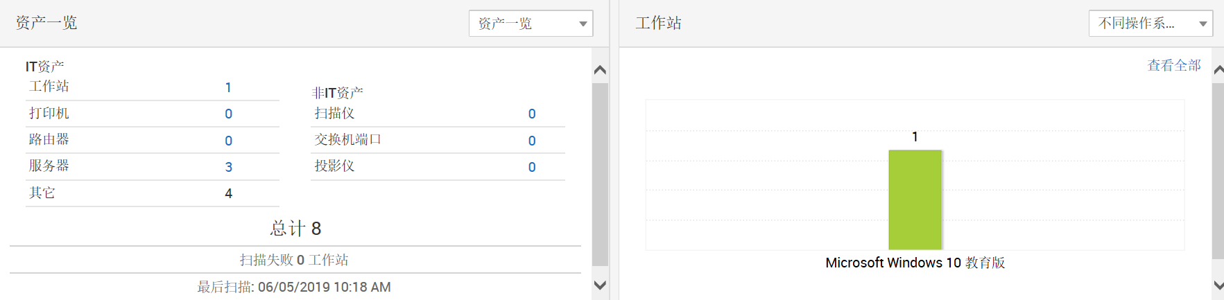 第一个窗口显示了组织中所有资产(IT和非IT)的概览。默认情况下,只显示工作站、打印机、路由器、服务器和其他设备的数量。点击“查看全部”,其他类别就会展开,显示其他IT和非IT资产,如接入点、交换机等。窗口还显示了扫描失败的工作站的数量,以及故障诊断的选项。通过单击资产旁边显示的数字,可以查看相关资产的列表。
