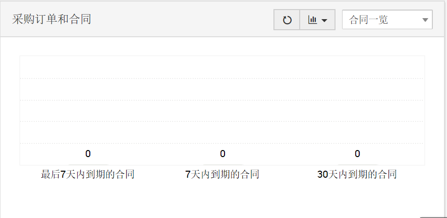 第四个窗口显示了采购订单(PO)和合同的阅览。从下拉菜单中选择采购订单一览,可以查看过期的PO、未来7天到期的PO和未来30天到期的PO。通过选择合同一览,可以查看最近30天内到期的合同、未来7天内到期的合同和未来30天内到期的合同。