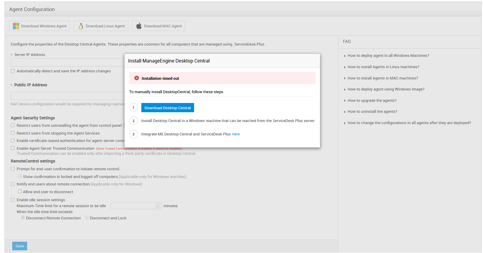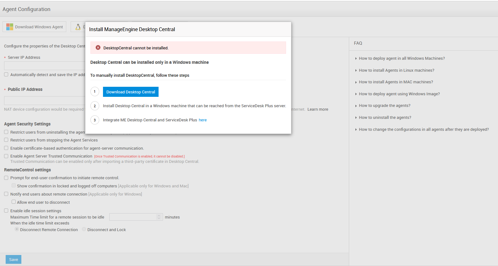 随着 ServiceDesk Plus 11300 版本的发布,现已引入对 Windows、Linux 和 Mac 机器的基于代理扫描。此功能由 ManageEngine Endpoint Central(原 DesktopCentral)提供。因此,所有现有客户在迁移到高于 SDP 11900 的版本时,都必须部署 ME Endpoint Central,以扫描其环境中的 Windows、Linux 和 Mac 机器。他们还需要在远程机器上安装 Endpoint Central 代理。以下文档记录了在此前未安装 Endpoint Central 的 AE 环境中部署 Endpoint Central 及其代理的步骤。
