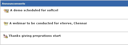 公告将显示在一个弹出窗口中,它显示了已经输入的公告的详细信息。公告标题会在登录主页中用粗体显示,旁边有一个表示新公告的图标。