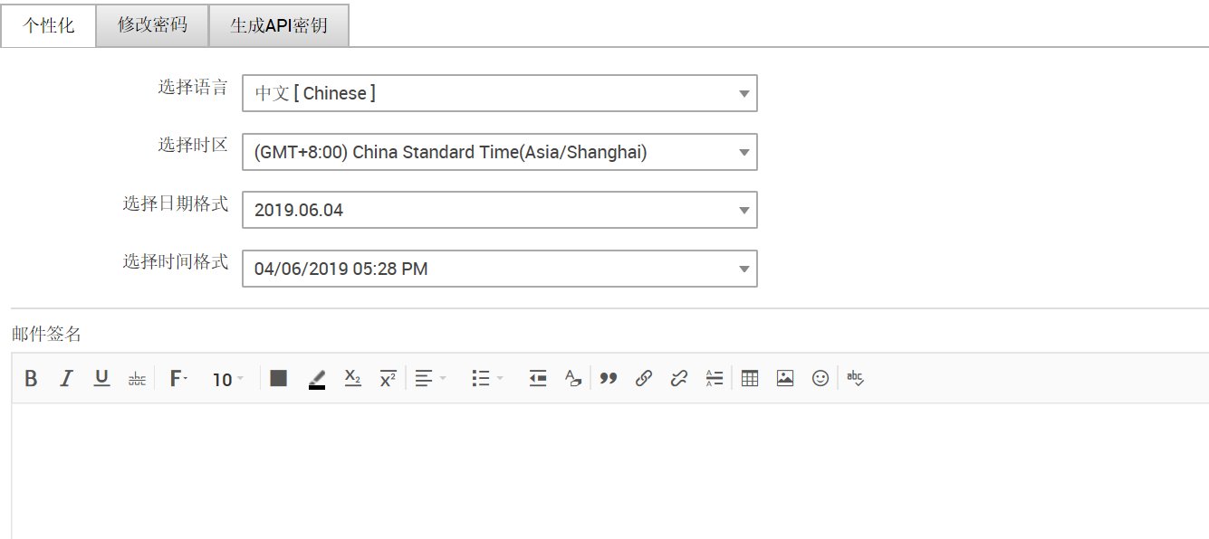 个性化选项卡由选择语言、选择时区、日期格式、时间格式和邮件签名组成。
