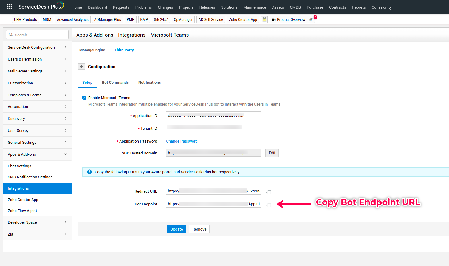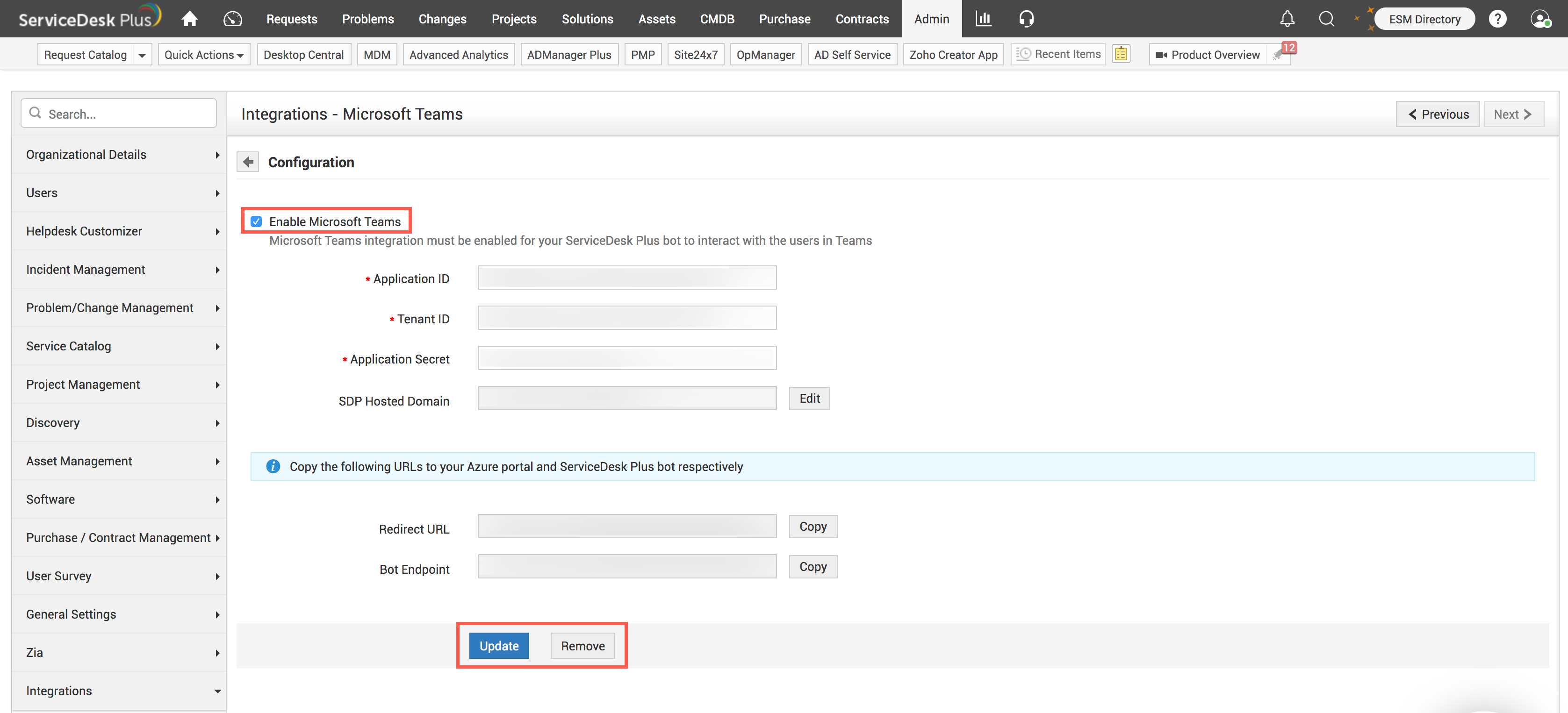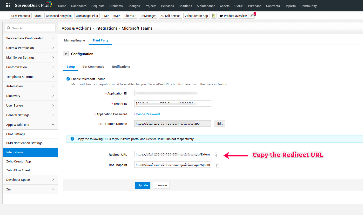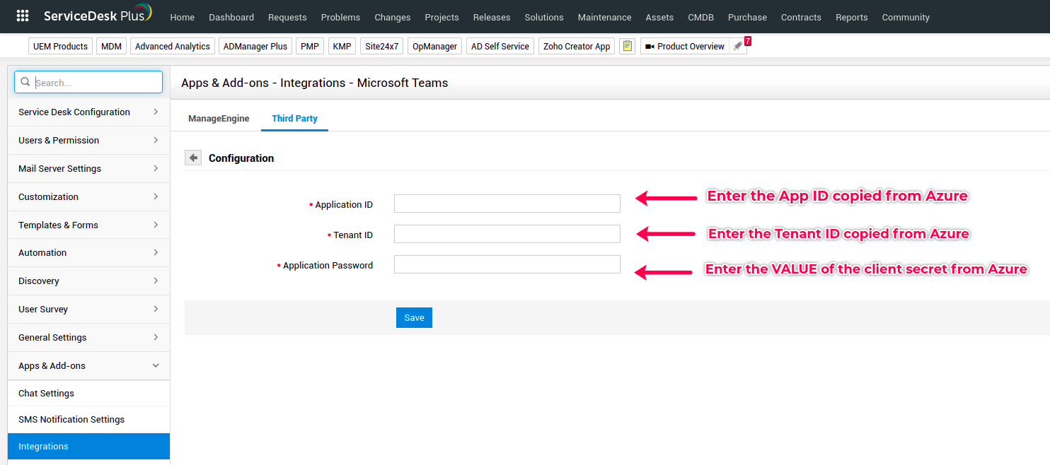 在 ServiceDesk Plus 中,转到 Admin > Integrations > Third Party > Microsoft Teams。