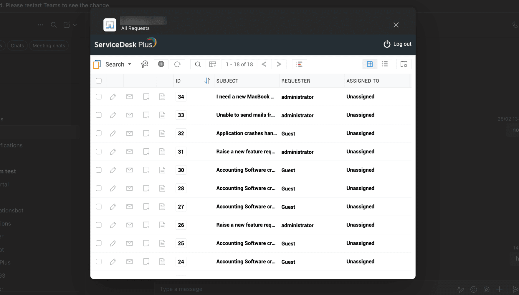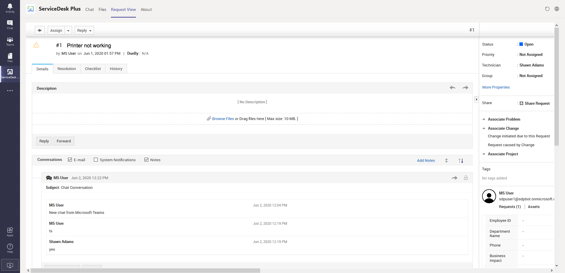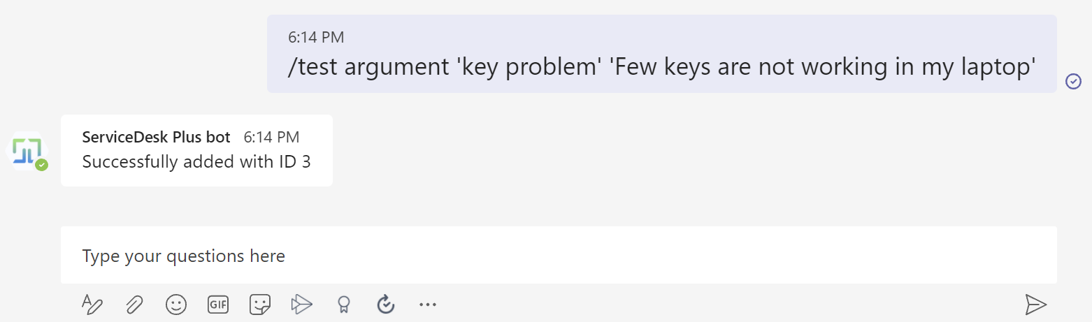 在 Microsoft Teams 机器人中调用该参数后,服务请求将被添加到 ServiceDesk Plus 中。
