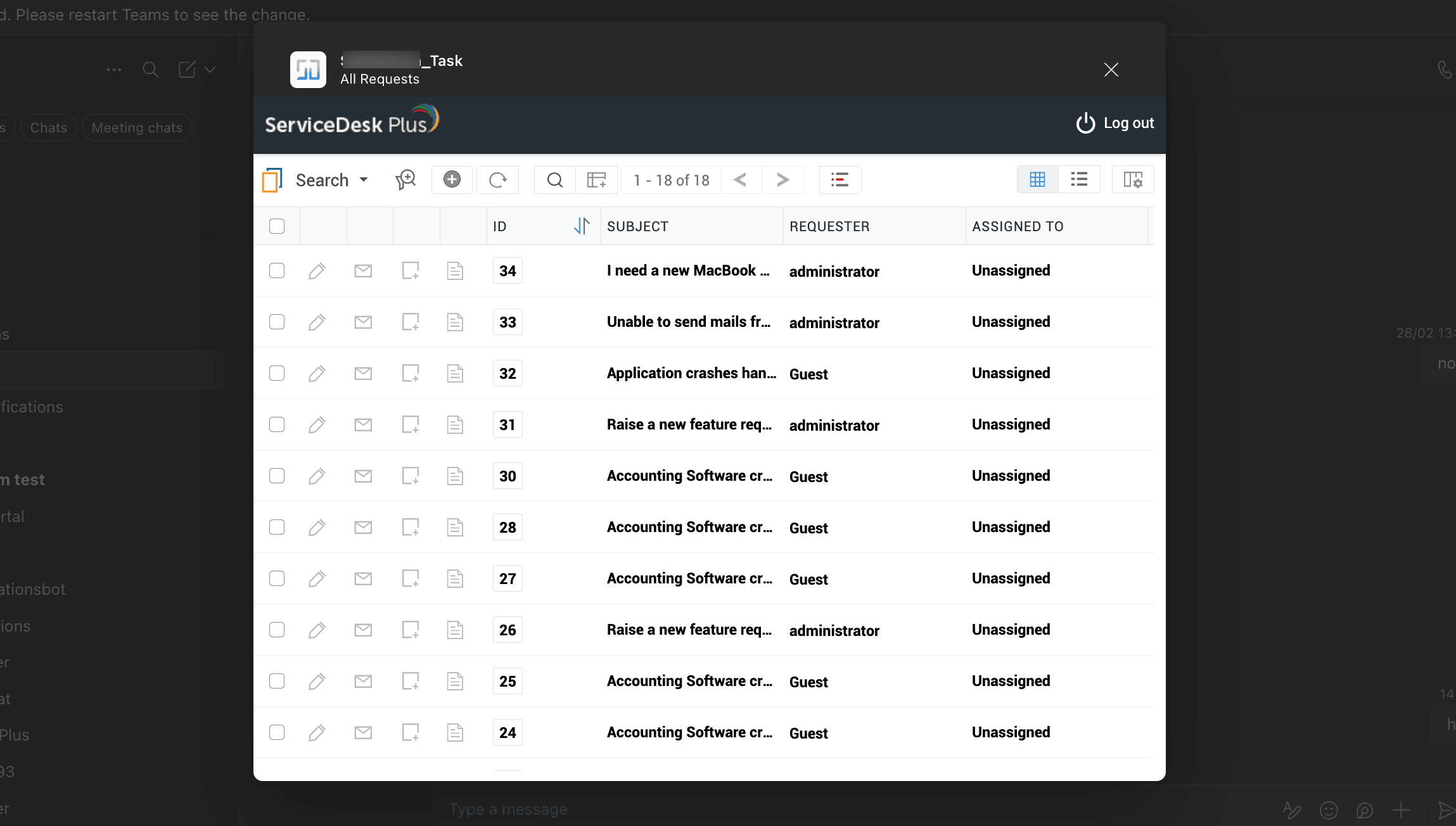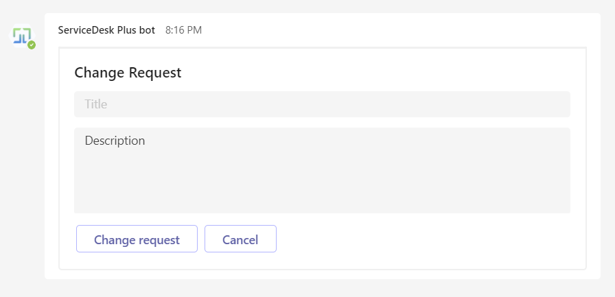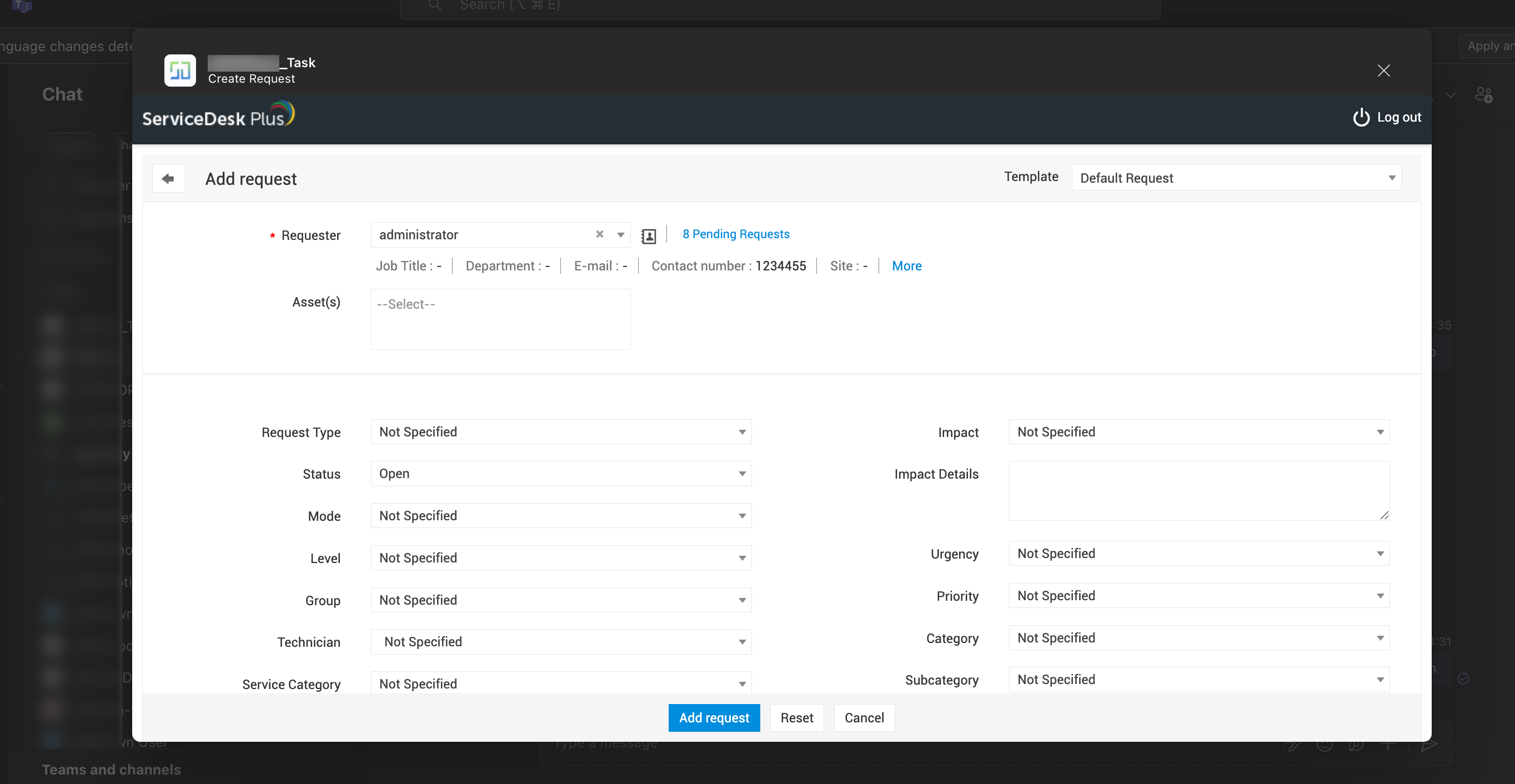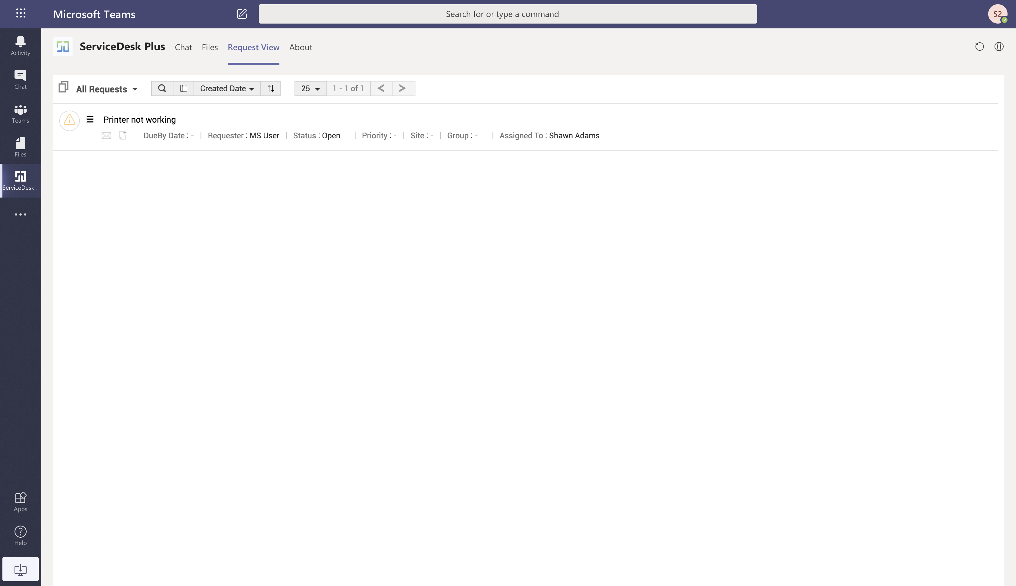 在 Microsoft Teams 机器人中调用该参数后,服务请求将被添加到 ServiceDesk Plus 中。