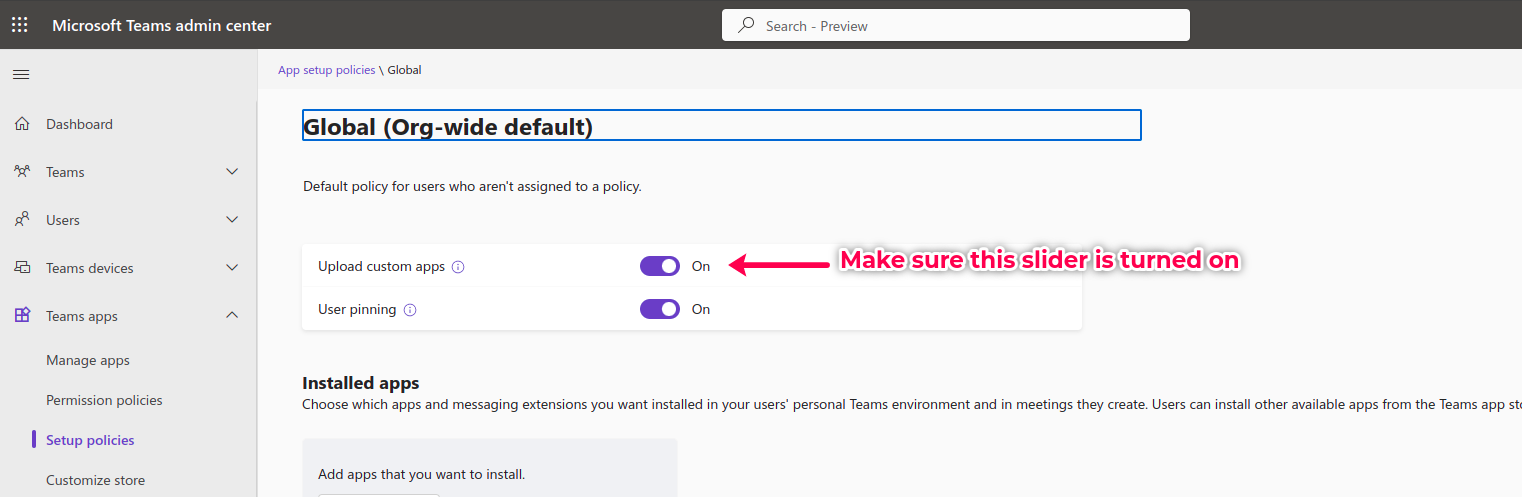 如果用户没有“上传自定义应用”的选项,请前往 MS Teams 管理中心的设置策略。选择您的组织,并确保“上传自定义应用”滑块已打开。