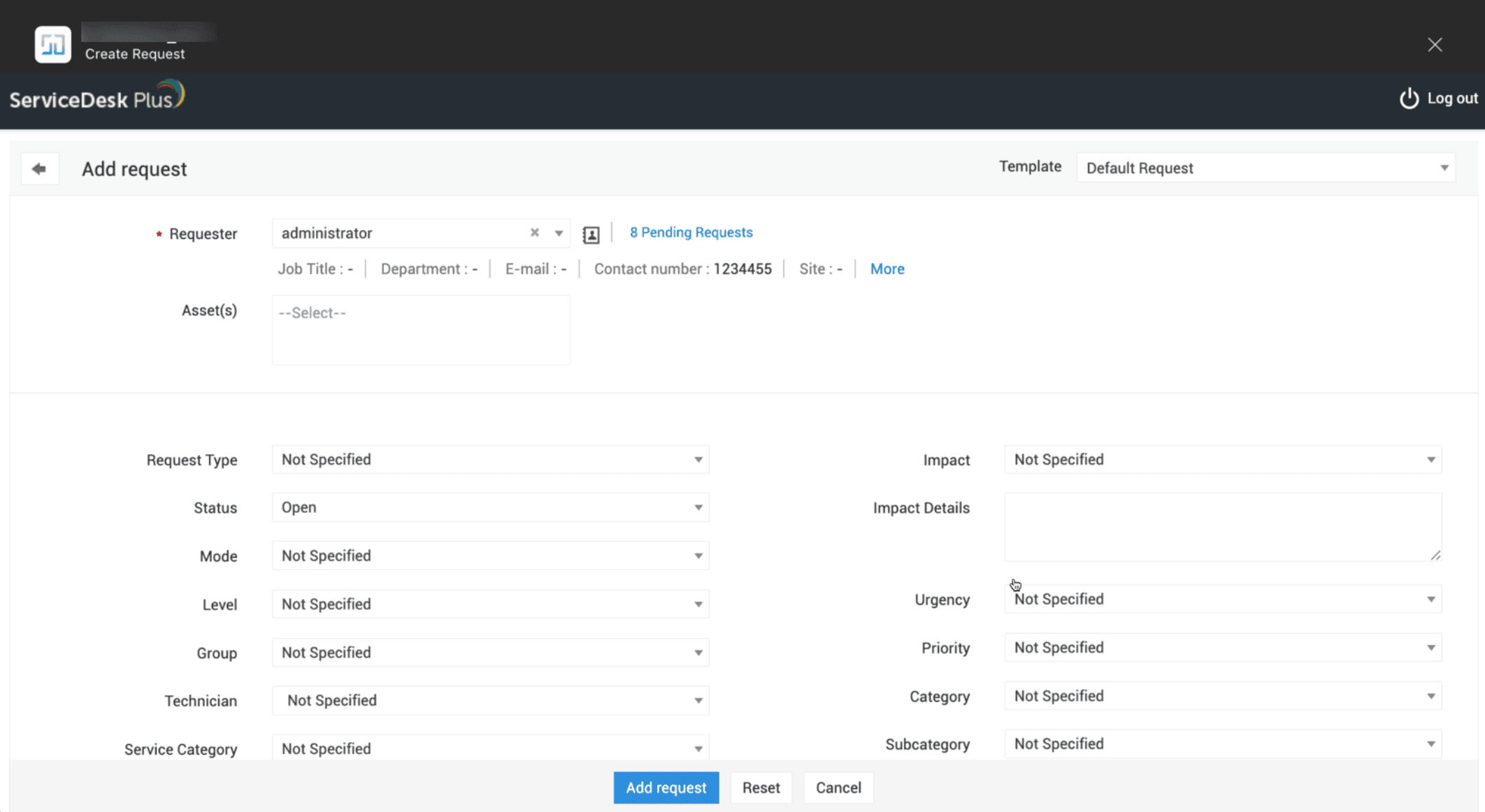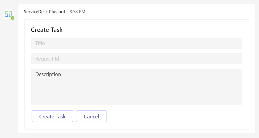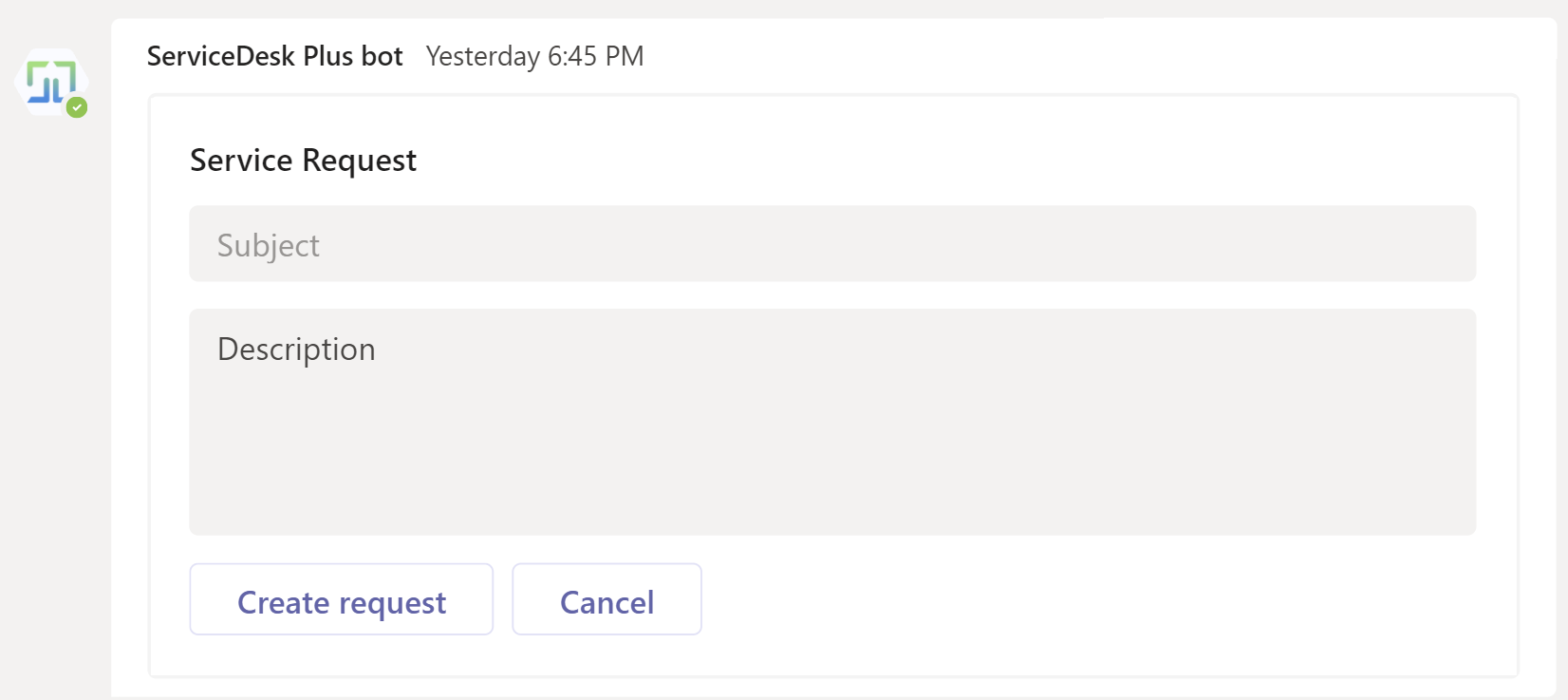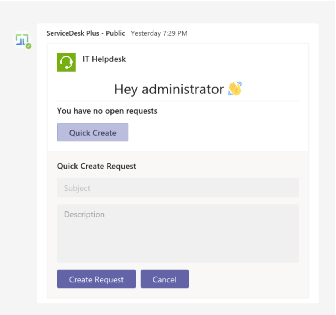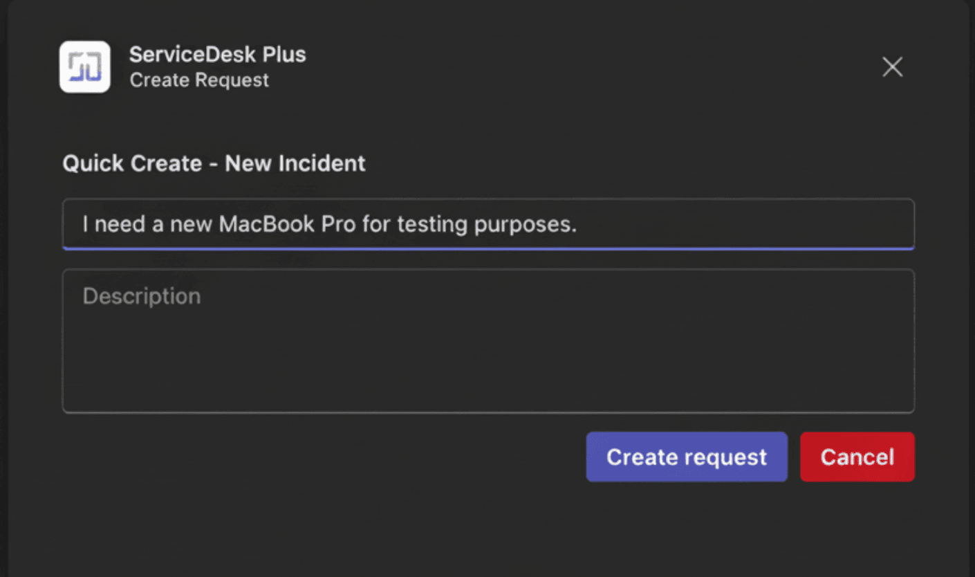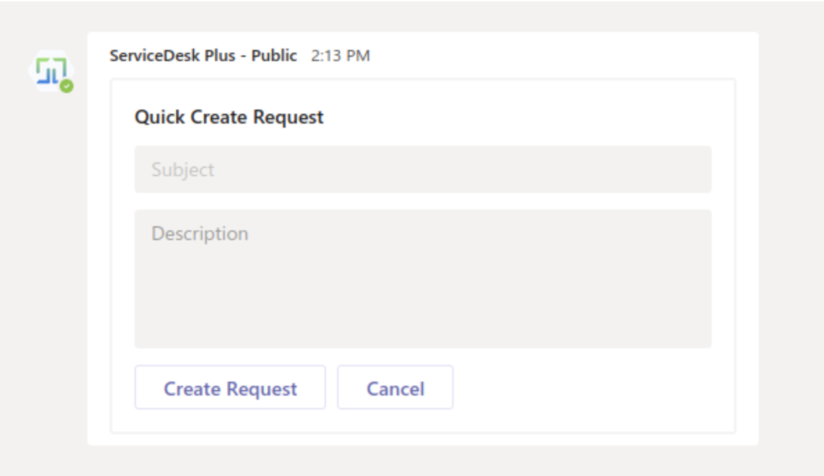 您可以使用快速创建功能,在 Microsoft Teams 内部直接在 ServiceDesk Plus 中创建请求。此功能的工作方式与 ServiceDesk Plus 中的快速创建功能相同。