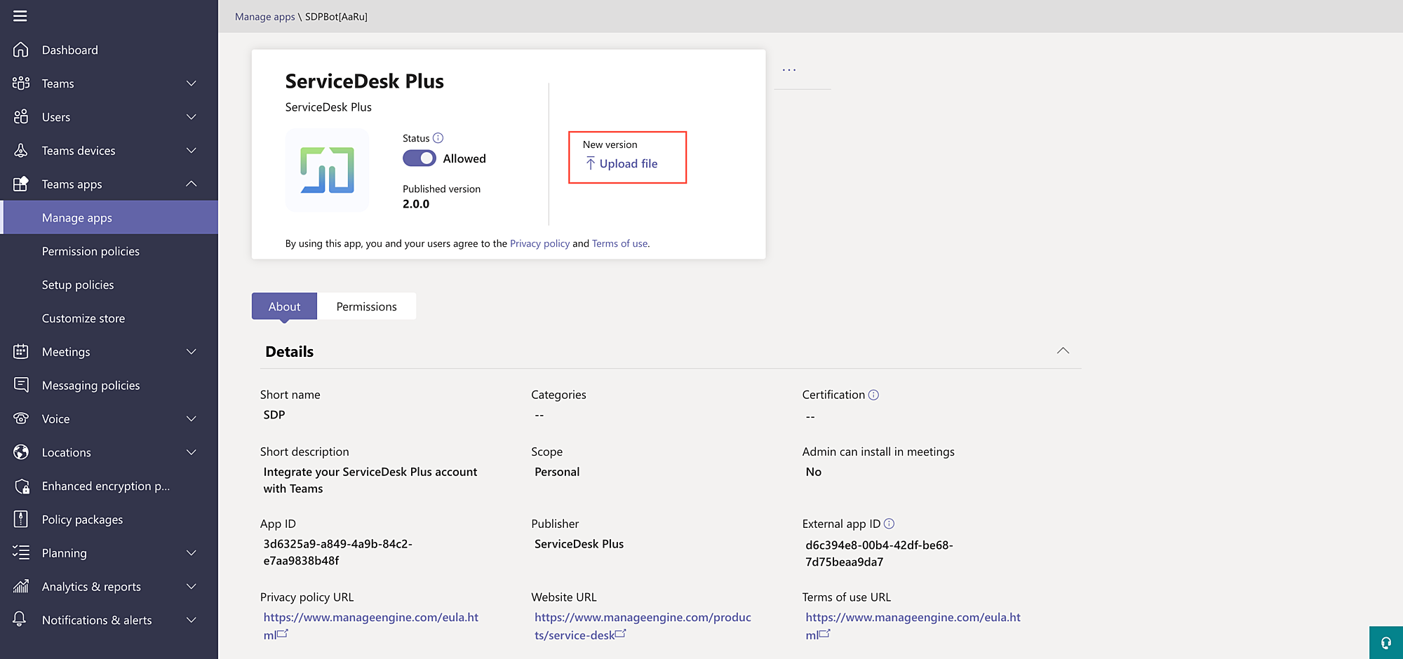 要将 Microsoft Teams 中现有的 ServiceDesk Plus 应用更新到最新版本,