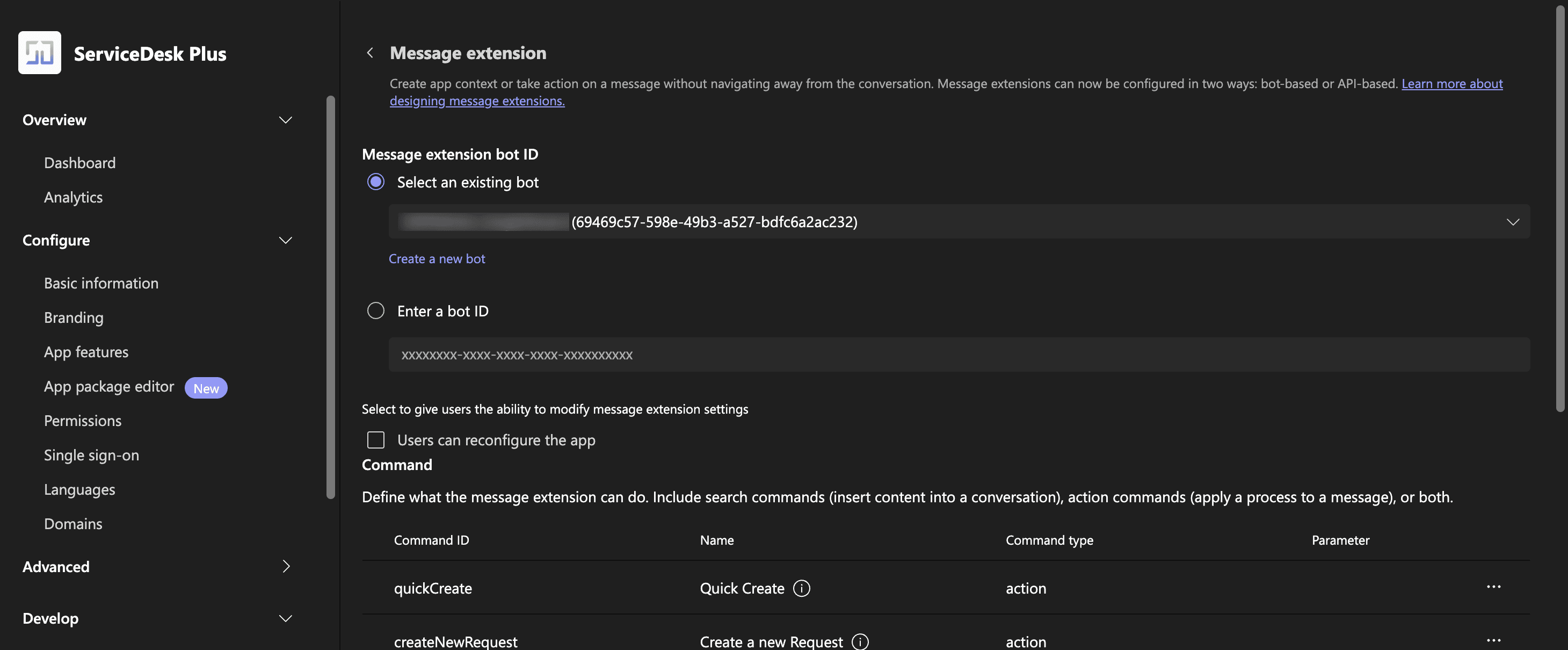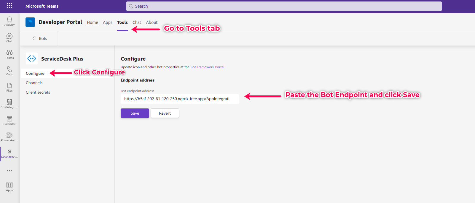复制机器人终结点 URL,前往 Microsoft Teams > 开发人员门户 > 工具选项卡 > 机器人管理 > 选择你的机器人 > 配置 > 粘贴从 ServiceDesk Plus 复制的机器人终结点 URL。完成后,单击保存。