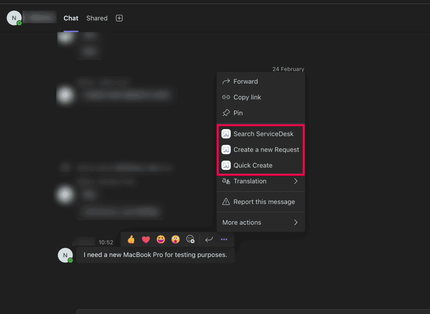 ServiceDesk Plus 在 Teams 中提供以下消息扩展: