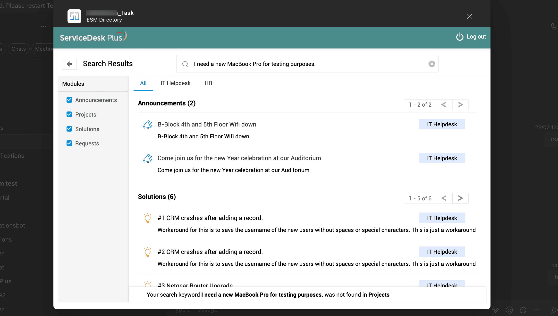 例如,如果用户查询为“存在网络问题”,并且 ServiceDesk Plus 中有一个标题为“WiFi 故障排除”的解决方案,则该解决方案将作为对用户查询的响应返回