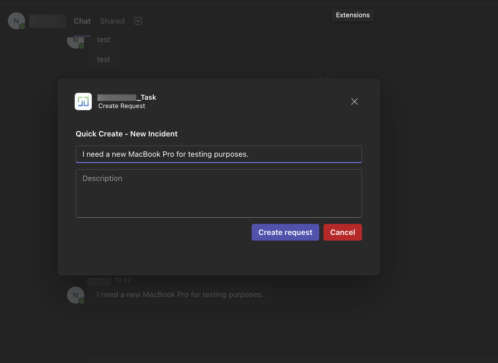 快速创建:直接从 Teams 消息中记录新的事件。消息内容会自动捕获为请求主题,用户也可以根据需要添加描述。