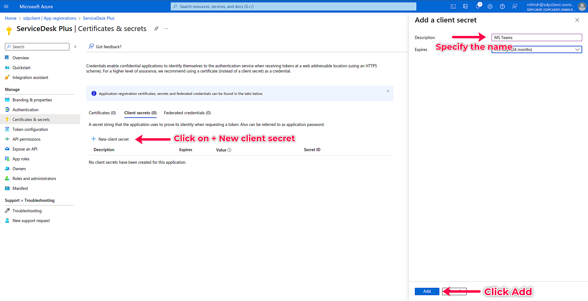 现在,在左侧窗格中,转到 Certificates and Secrets,然后点击 +New Client Secret。复制该 Secret 的 VALUE,而不是 Secret ID,并将其保存在文档中。