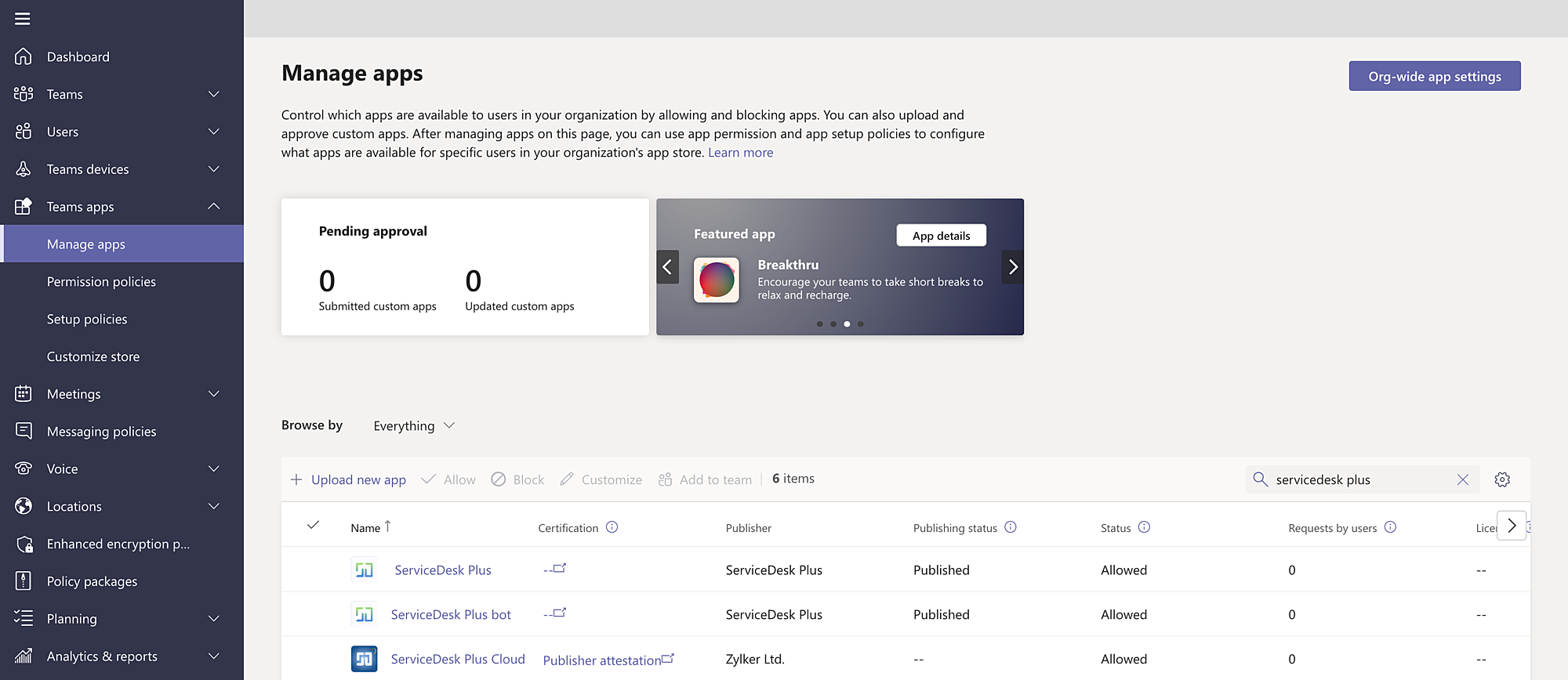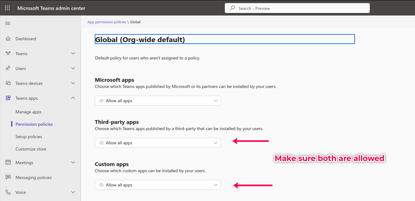 上传应用后,如果该应用持续从 MS Teams 中消失,请前往 MS Teams 管理中心的权限策略。选择您的组织,并确保已允许自定义应用和第三方应用。