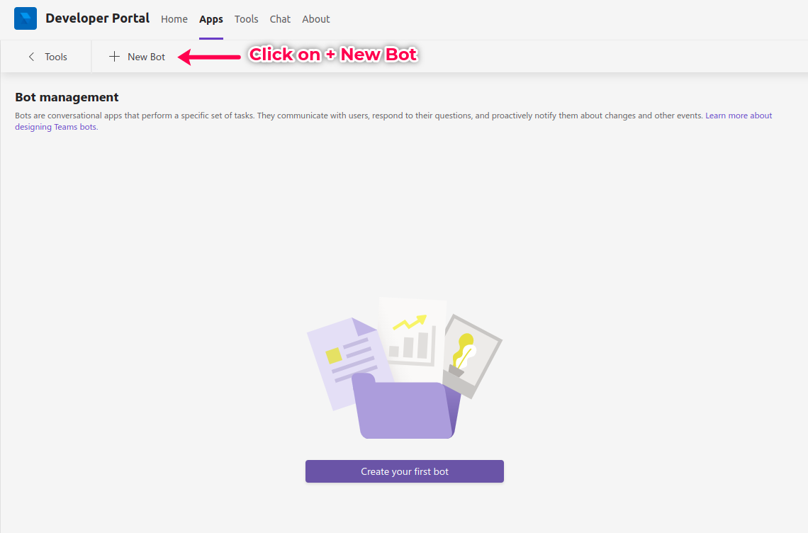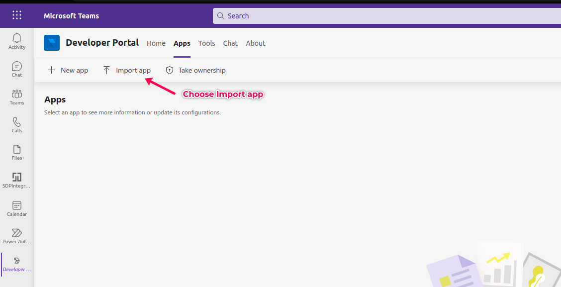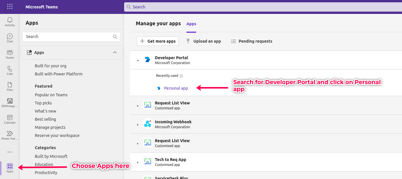 导航到 MS Teams 中的 Developer Portal。要找到 Developer Portal 应用,请单击左侧窗格中的“应用”,然后搜索/选择 Developer Portal。