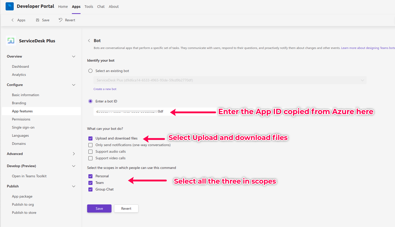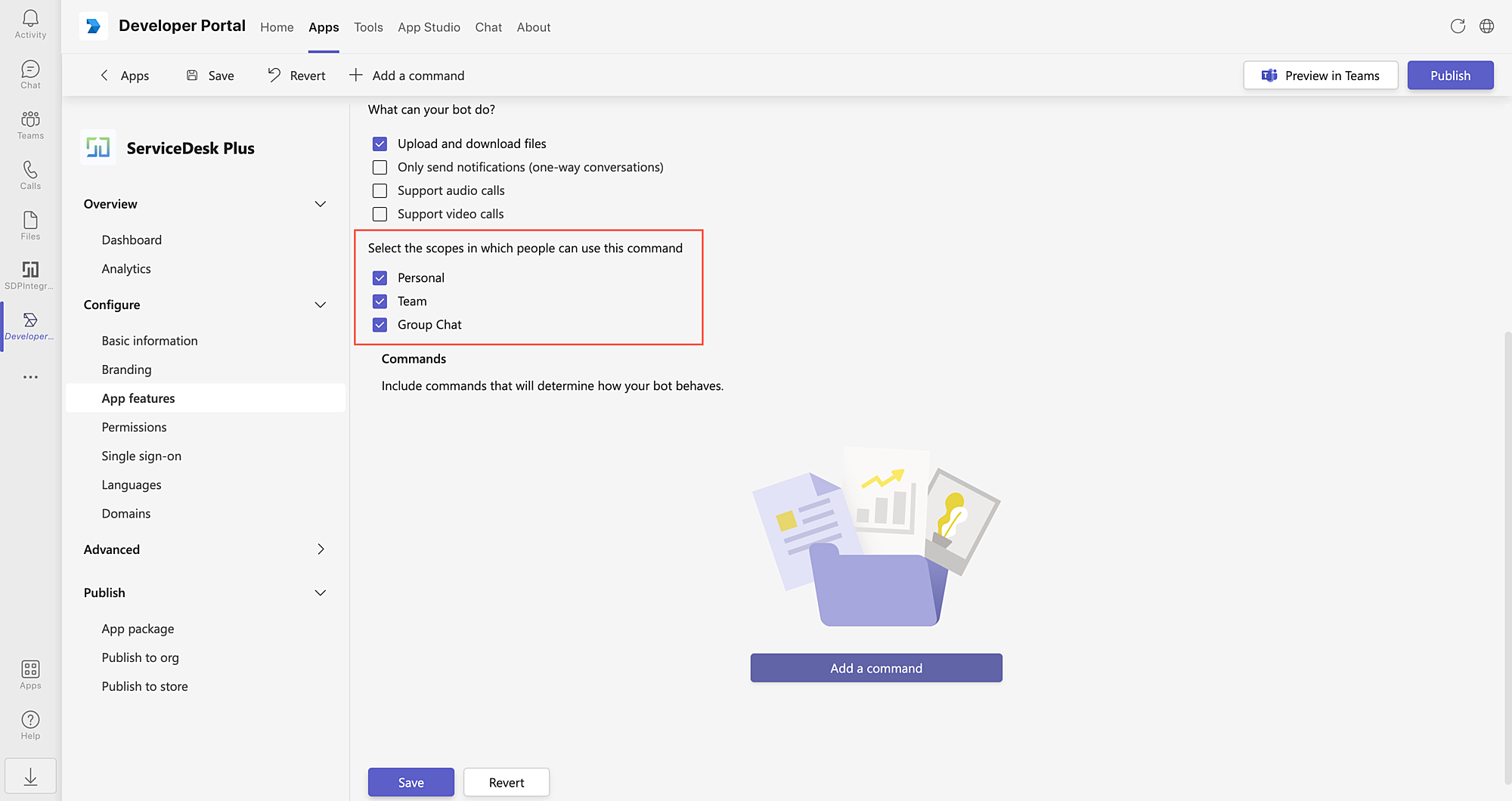现在在你的机器人可以做什么?部分下,选择上传和下载文件。在范围下,选择这三个选项(个人、团队和群聊)。