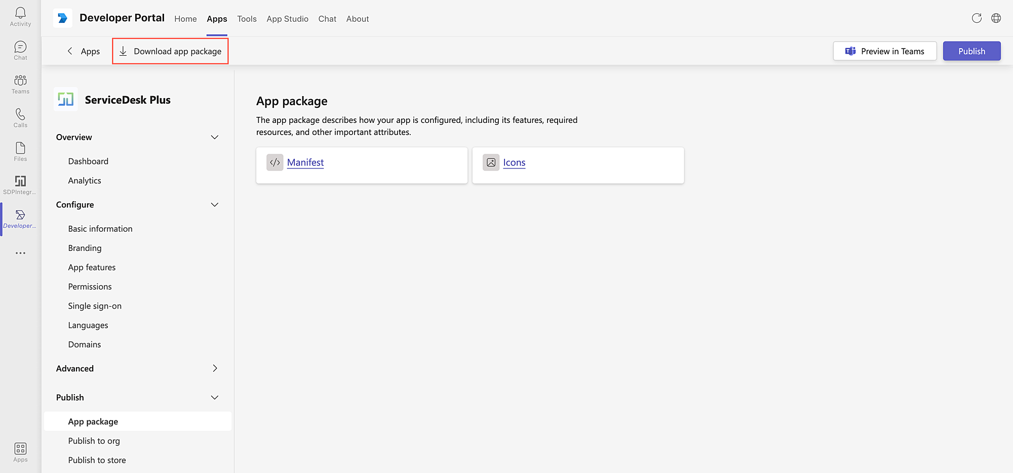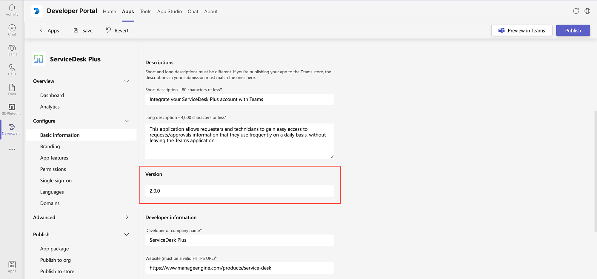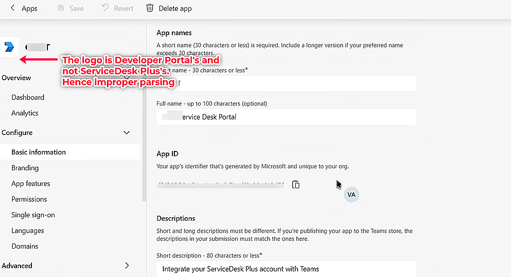 如果在输入“/help”消息后机器人仍未返回登录卡片,请前往 Developer Portal 并进入 Apps 选项卡。选择已创建的 ServiceDesk Plus 应用。现在,如果左上角显示的应用图标不是 ServiceDesk Plus 的图标,而是其他内容,则说明 Microsoft 未正确解析该应用。请联系技术支持以修复应用清单。下方是应用解析不正确的示例截图。