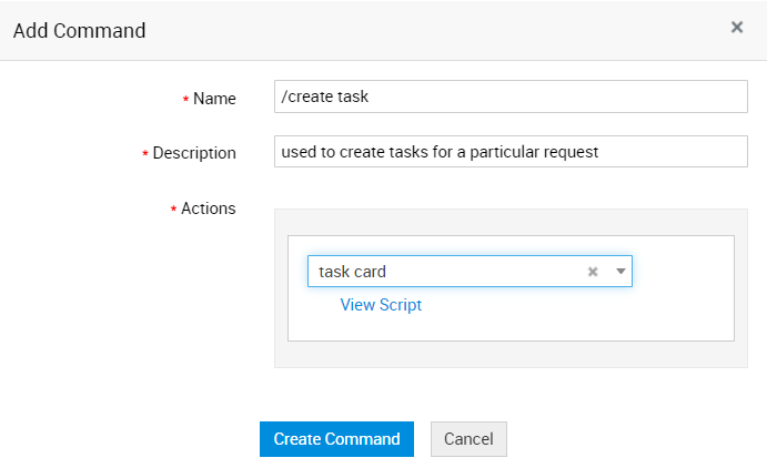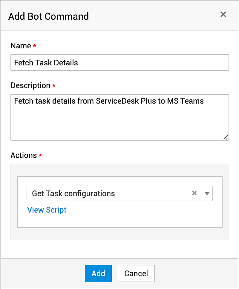 默认情况下,ServiceDesk Plus 包含一组可从 Microsoft Teams 调用的默认命令。您可以创建更多自定义命令,并使用 ServiceDesk Plus 机器人直接在 Microsoft Teams 中执行任何操作。
