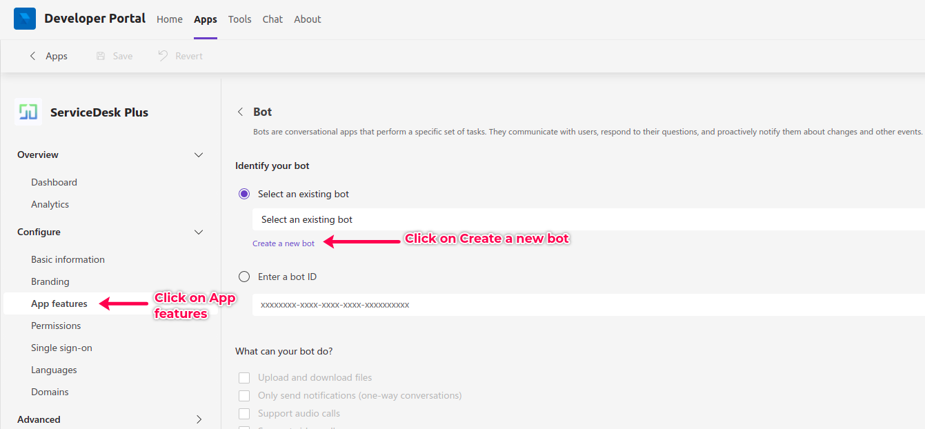 前往开发人员门户中的应用选项卡,选择已导入的应用。在左侧窗格中单击应用功能,然后选择“机器人”。