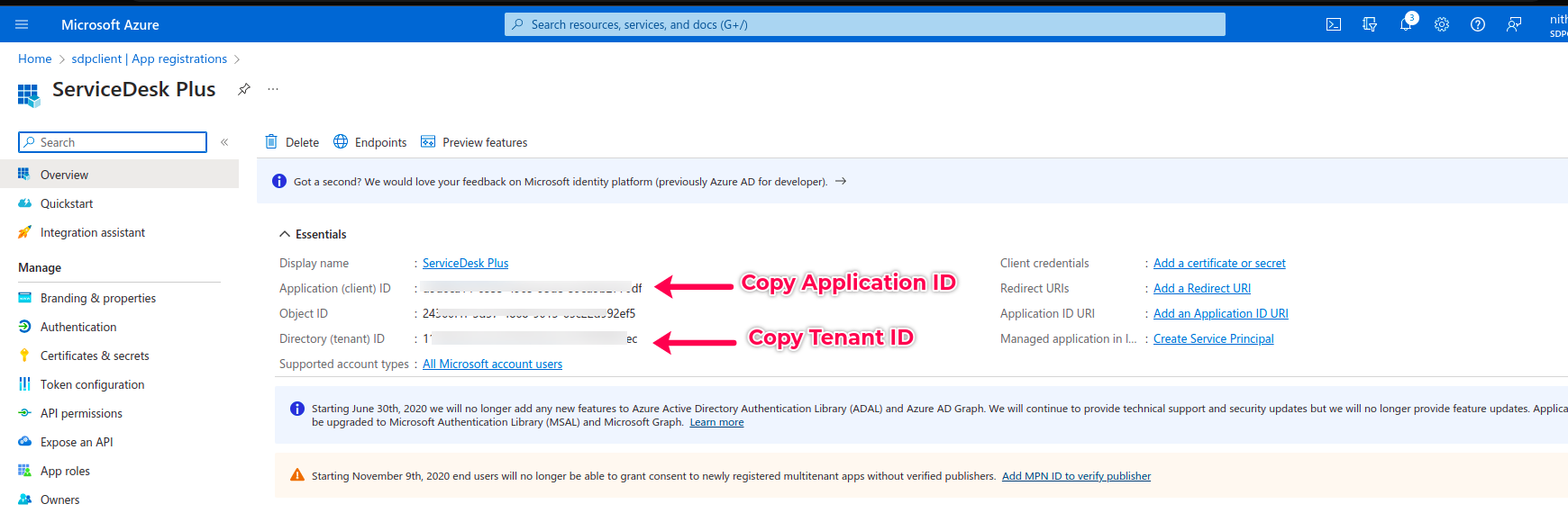 复制 Application (Client) ID 和 Tenant (Directory) ID,并将其保存在文档中。后续集成时会用到它们。