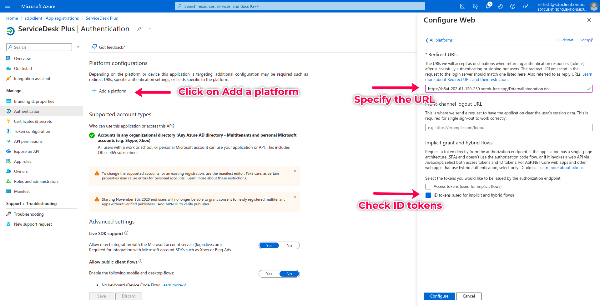 单击+ 添加平台 > Web > 在重定向 URI 下,粘贴从 ServiceDesk Plus 复制的重定向 URL。勾选底部的 ID 令牌复选框,然后单击配置。