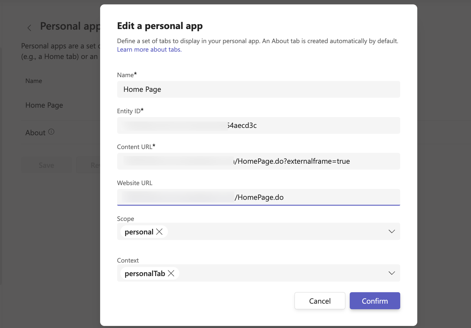 将范围选择为“personal”,并在 Context 下选择“personalTab”。