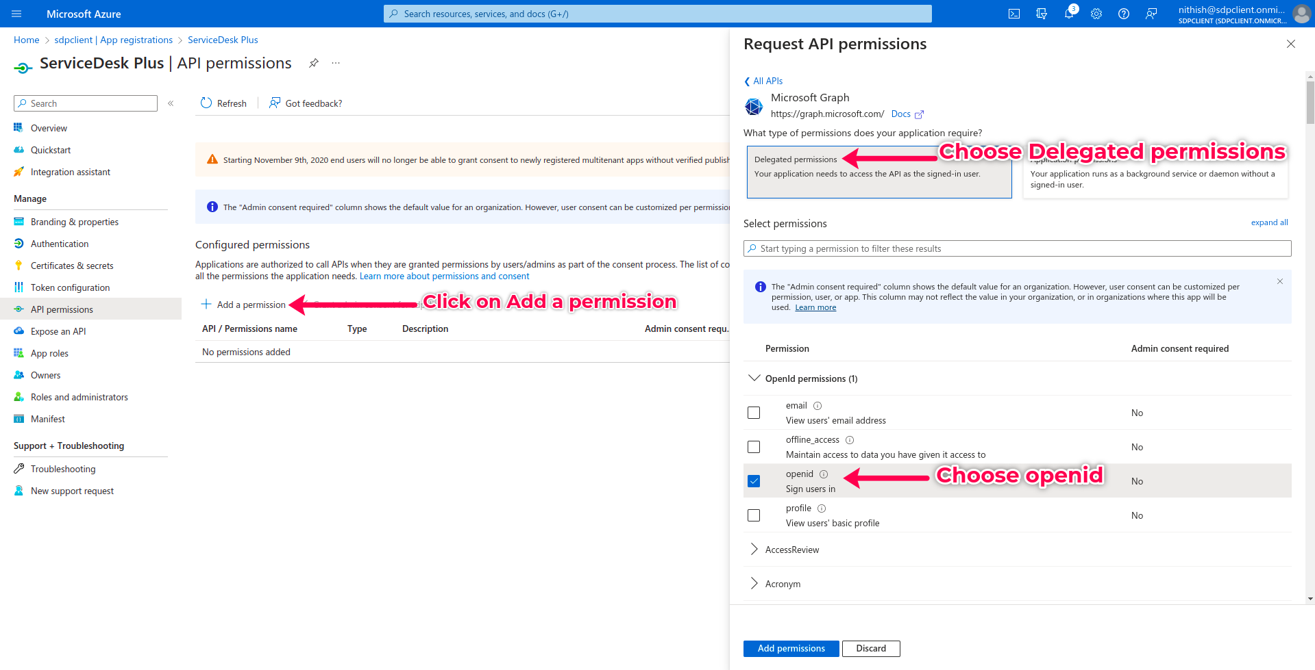 现在,在左侧窗格中,转到 API permissions,点击 +Add a permission > Microsoft Graph > Delegated Permissions,然后选择“openid”。