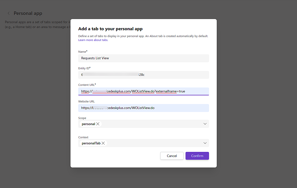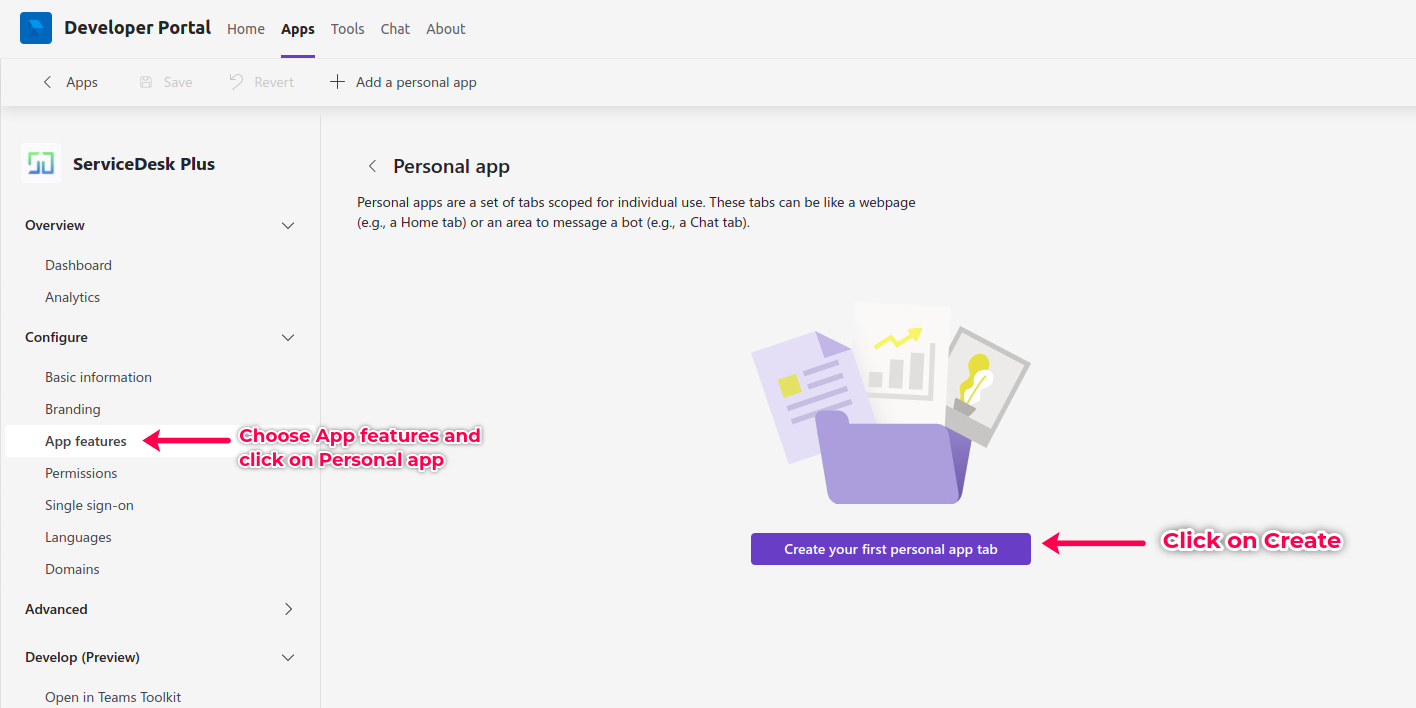 Personal Tab:此个人选项卡可用于在 Microsoft Teams 应用中查看 ServiceDesk Plus 中的打开请求。要设置该选项卡,请选择 Choose App features > 选择 Personal app > Create your first personal app tab。