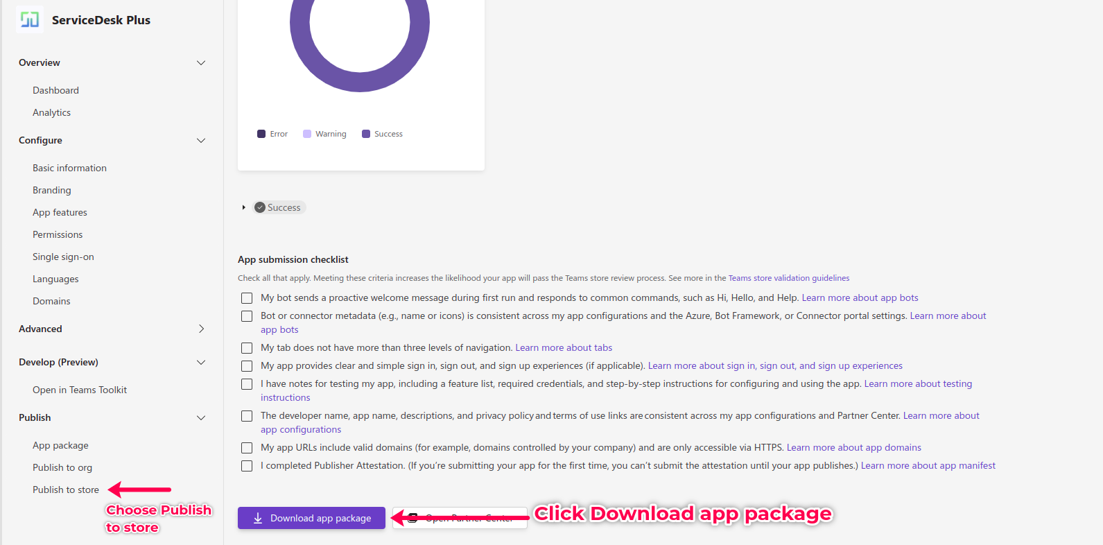 在左侧面板中,转到 Publish to Store。滚动到底部并单击 Download app package。应用程序包 zip 文件将下载到您的计算机中。
