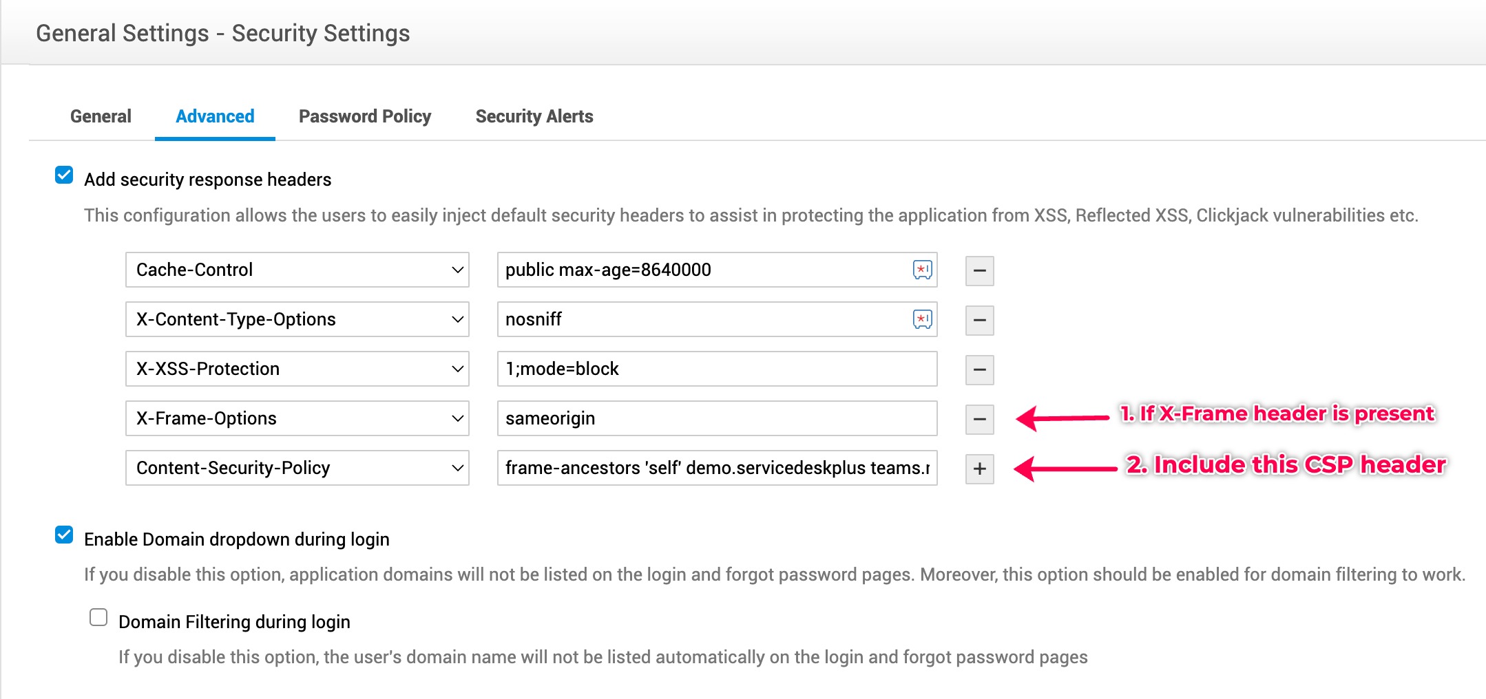 如果请求列表视图选项卡仍然无法加载,请检查安全设置中是否存在额外的标头。如果实例包含“X-Frame-Options”标头,则会导致渲染失败。请再添加一个“Content-Security-Policy”标头,并将其值设置为 'frame-ancestors 'self' <servicedesk-domain> teams.microsoft.com',以按下图所示修复此问题。例如,如果您的域名是 https://demo.servicedeskplus.com,则 CSP 标头应为 frame-ancestors 'self' demo.servicedeskplus.com teams.microsoft.com。此变通方法仅适用于 Microsoft Teams Web 应用,不适用于 Microsoft Teams 桌面应用。如果仍然无效,请联系技术支持。