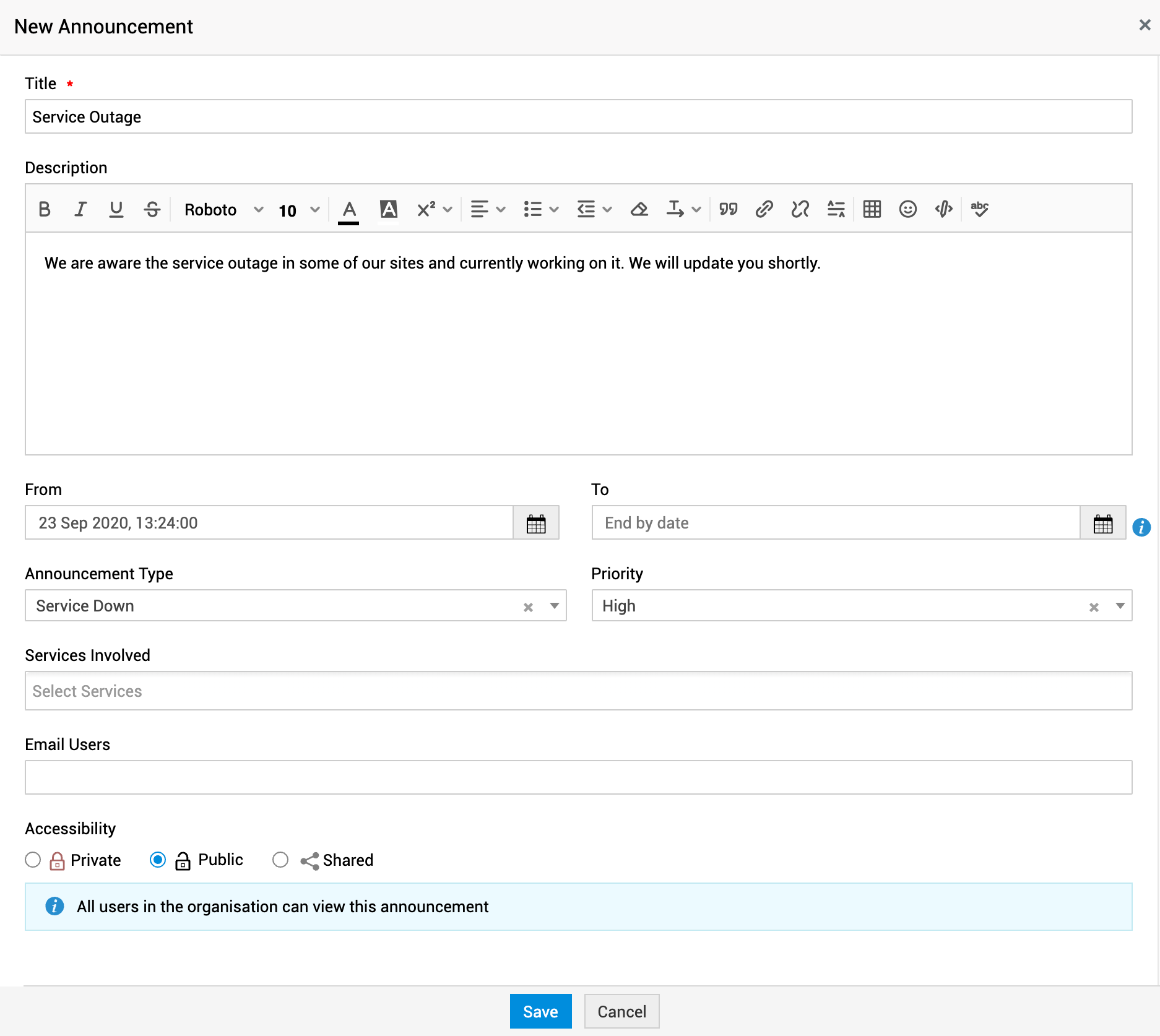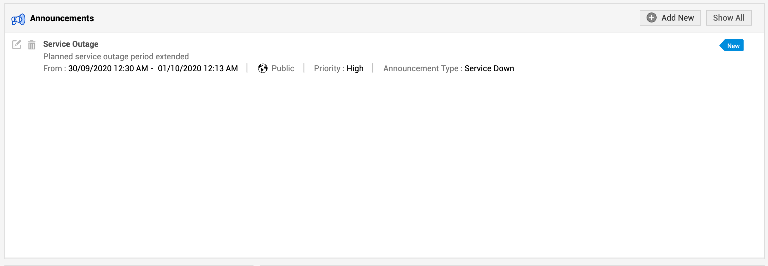 ServiceDesk Plus 允许您发布面向整个公司的公告,或仅面向技术人员组发布公告。公告小组件位于首页的“我的视图”选项卡下。 任何技术人员都可以添加、编辑和删除公告。