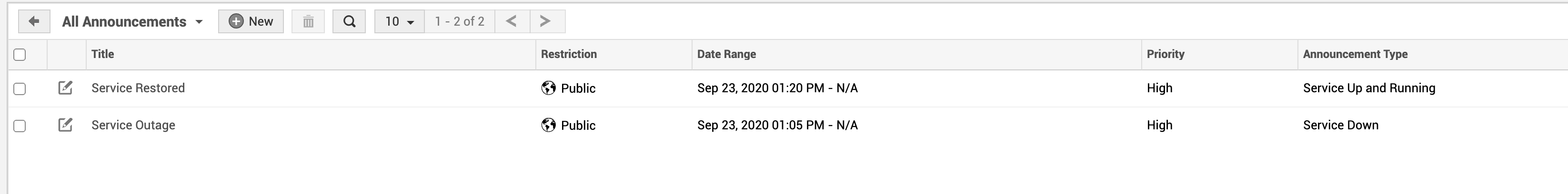 最近的公告将显示在此框中。要查看所有公告(包括已完成的公告),请单击“显示全部”按钮。这将显示截至目前添加的所有公告列表。