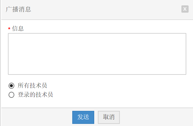 在广播消息段, 输入你的信息,选择将消息发送给所有技术员或者 登录的技术员,然后点击发送