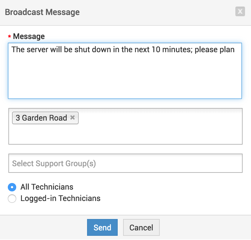 在打开的 广播消息 对话框中,输入您的消息,选择您是否要将消息发送到特定的 站点 或 组。如果您希望将消息发送给所有技术人员,或仅发送给当前已登录的技术人员,请选择相应的选项并单击 发送