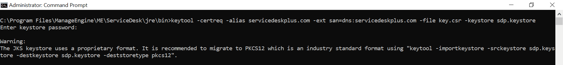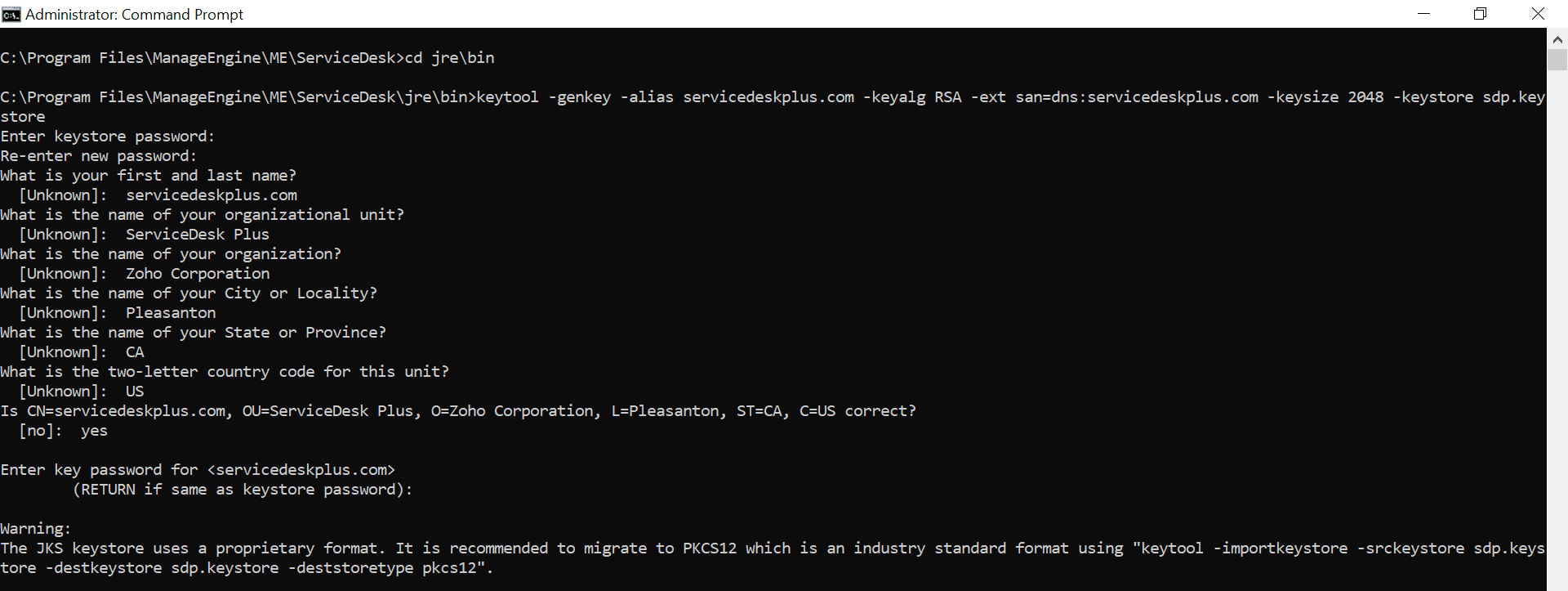 为了使 ServiceDesk Plus Server能够向 Web 浏览器和用户正确标识自身,您需要为 ServiceDesk Plus 主机从 CA 获取一个新的签名证书。您可以使用 keytool(Java 自带)创建证书、获取 CA 签名并在 ServiceDesk Plus 中使用。