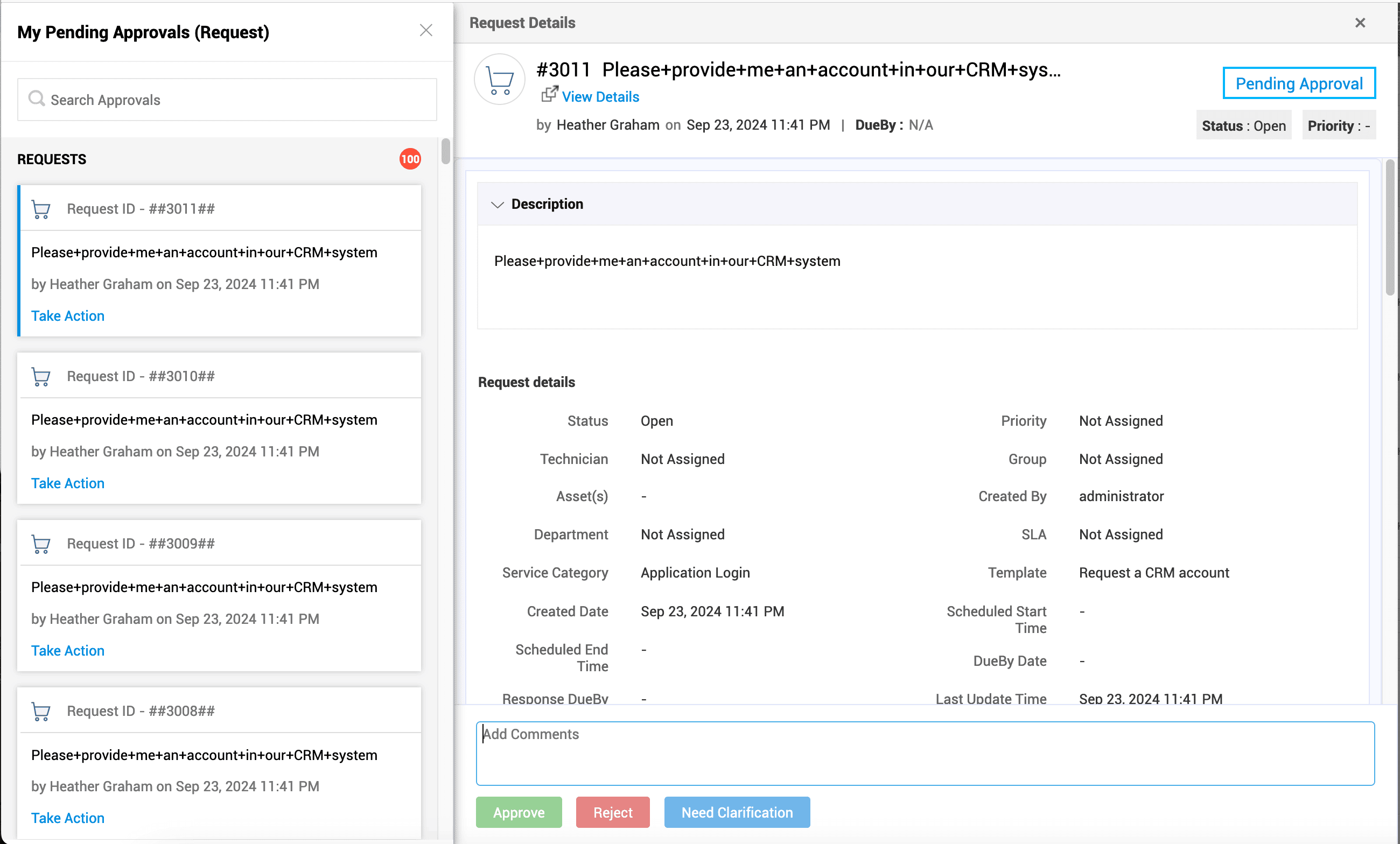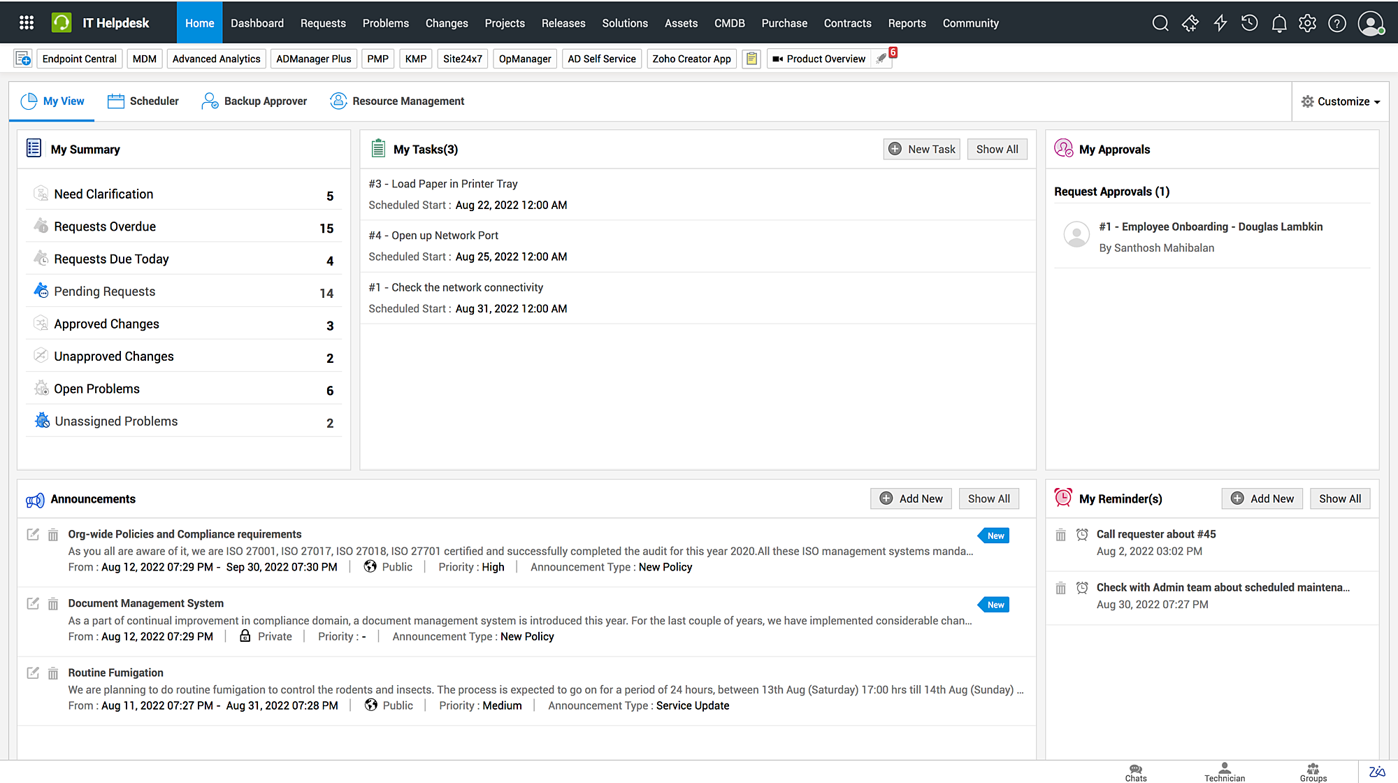 我的摘要 - 此小组件会通知已登录的技术人员需要其关注的事件/服务请求、问题请求和变更请求的数量。请求按需求、紧急程度或审批状态分类,并显示每个类别中的请求数量。您可以单击某个类别以查看更多请求详细信息。