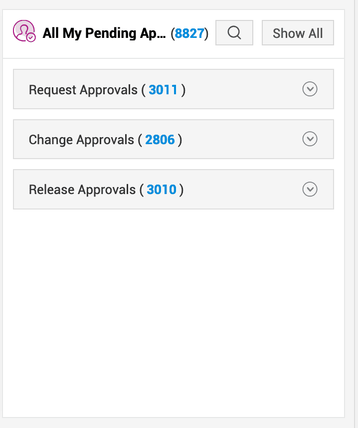 我的审批 - 此处列出了所有等待已登录用户审批的请求、变更和发布。审批按模块分组显示。此小组件仅对具有审批权限的用户可见。要执行审批操作,请按以下步骤进行: