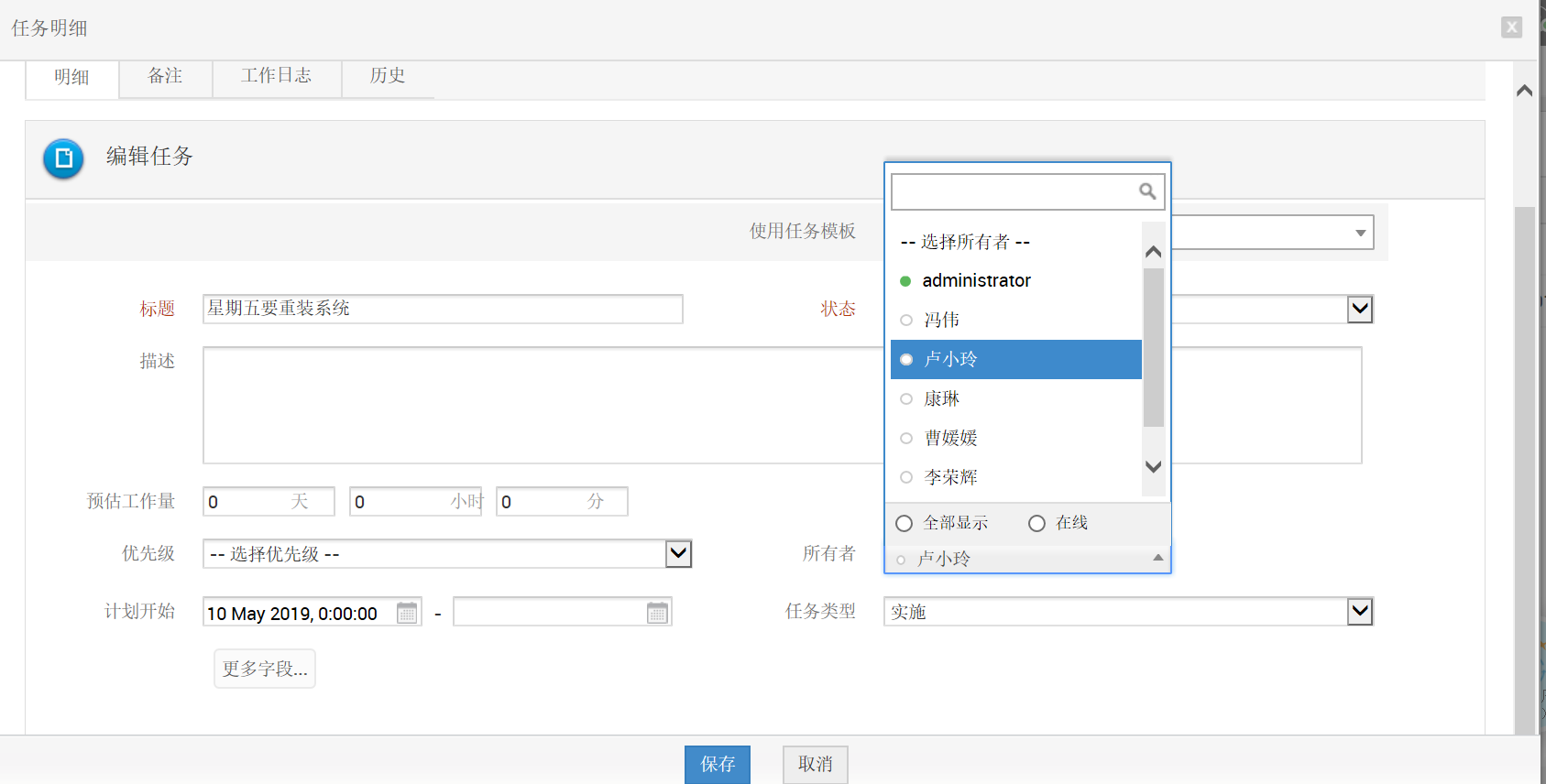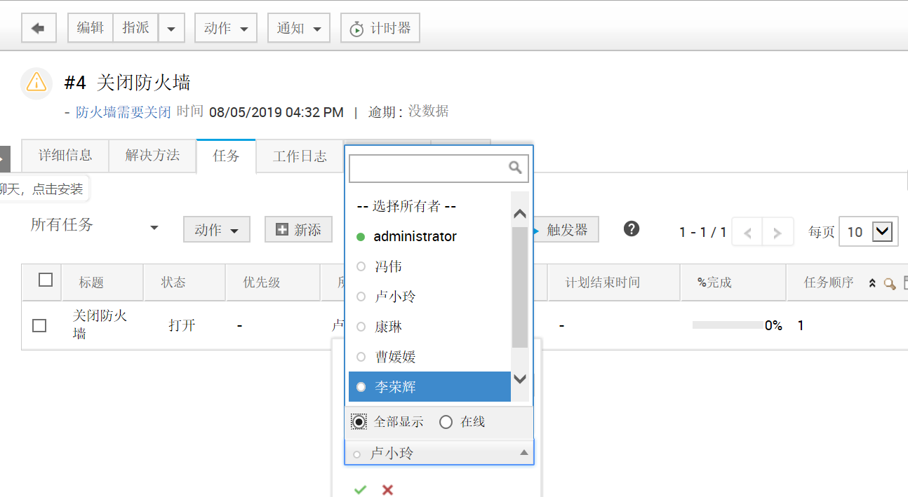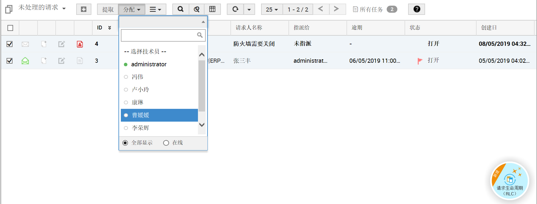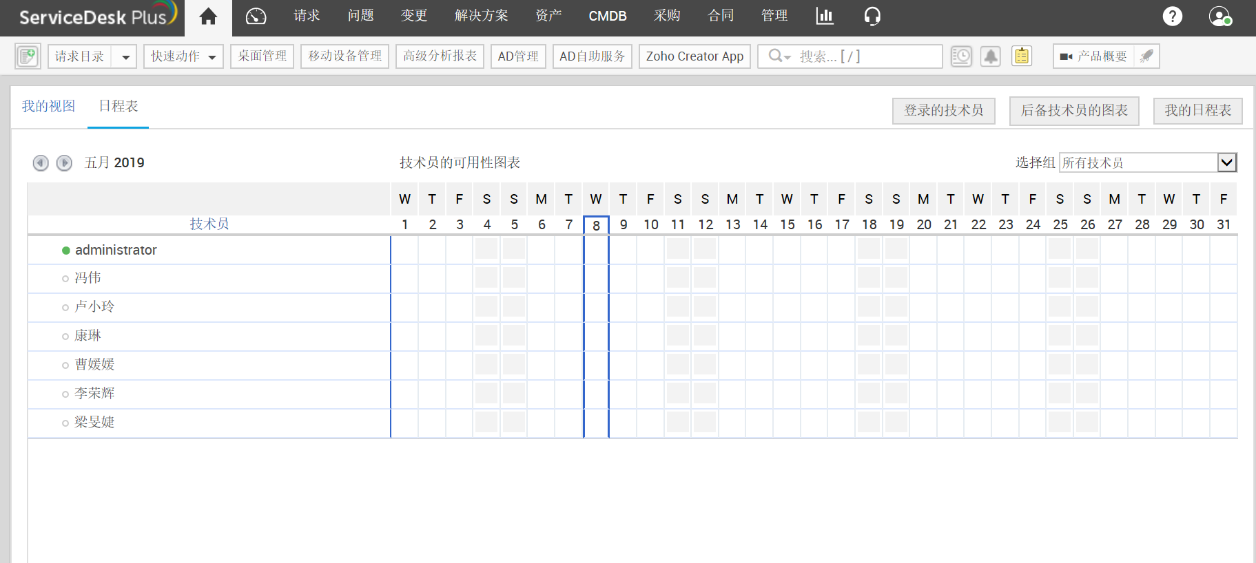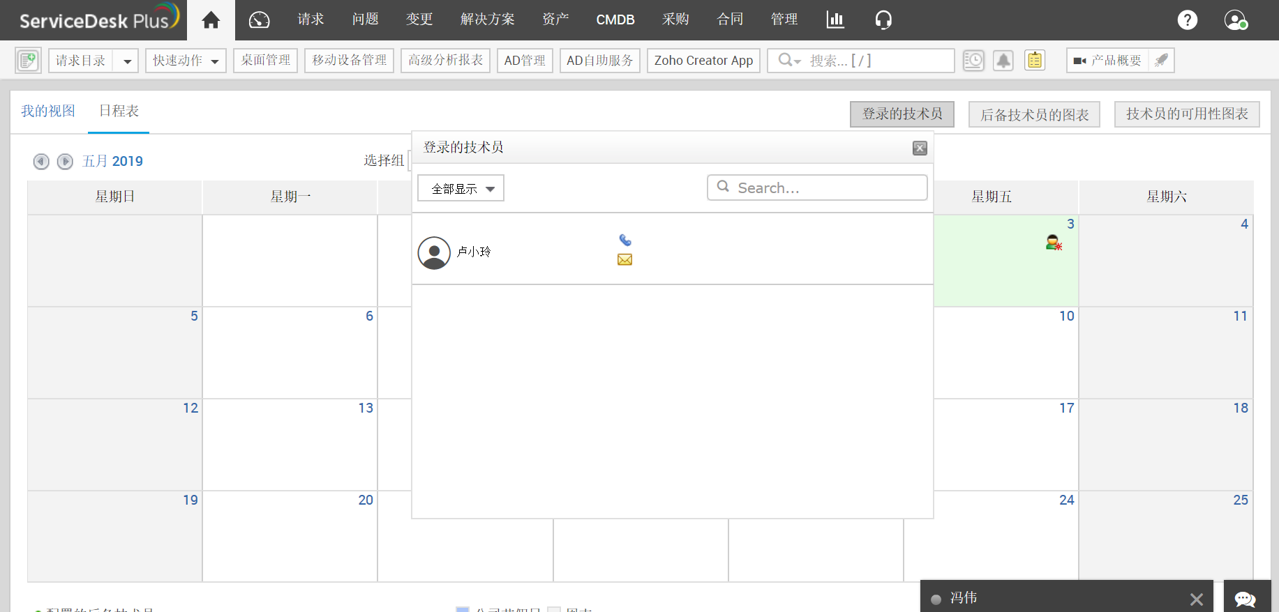 管理员或技术员可以通过在线/离线标记人员可用性。这有助于管理员和其他技术员向可用的技术员分配任务/请求。 还将有助于备份技术人员的安排。技术员在线时将用绿色圆点表示,离线时用灰色圆点表示,未登陆技术员用透明圆点表示。