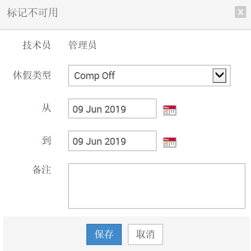 使用技术员的可用性图表可为其他技术员标记休假。您也可以直接点击快速动作 ->标记不可用来配置技术员的休假。其他步骤同上。