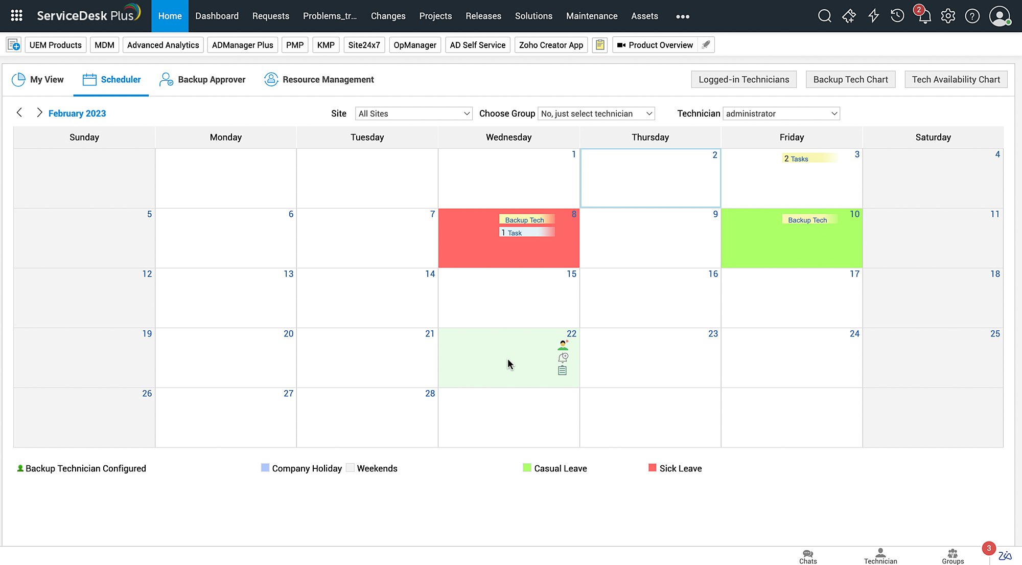 单击 Scheduler 模块下的 Quick Actions > My Schedule。这将打开日程日历。默认情况下,日历会显示如下所示分配给您的未关闭请求、问题、变更、任务和提醒的数量,