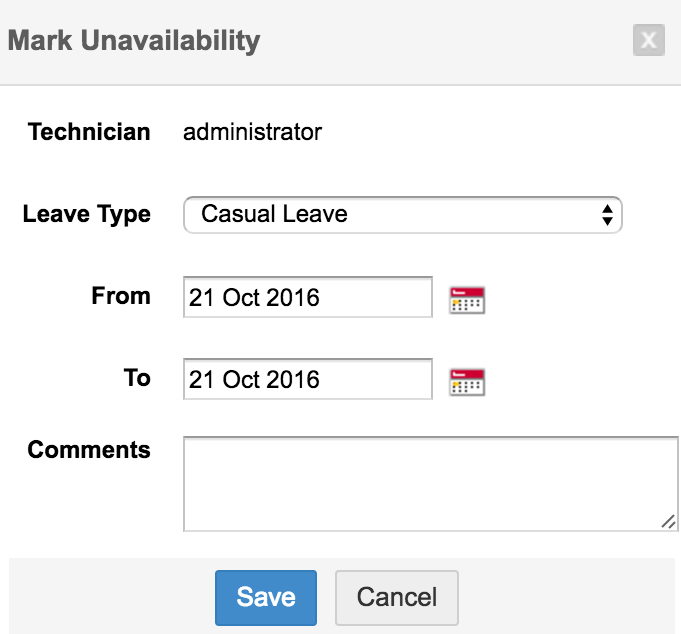 也可以使用技术人员可用性图表为其他技术人员标记请假。您可以通过单击 Scheduler 模块下的 Quick Actions -> Mark Unavailability 来配置您的请假。这将打开“标记不可用”弹出窗口。 按照上述步骤标记请假。