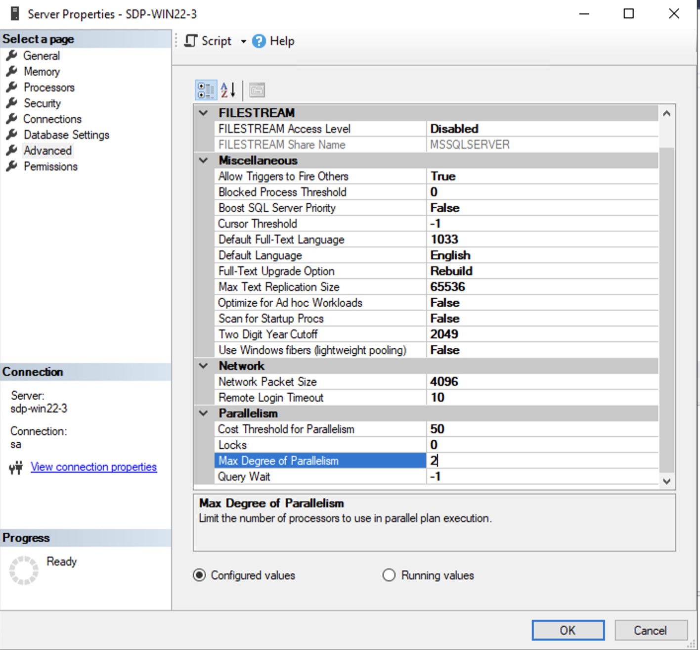 在 MSSQL 服务器中配置最大并行度 (MAXDOP) 和并行阈值成本 (CTFP) 值。我们建议将 MAXDOP 设置为 2,CTFP 设置为 50,以防止查询资源拥塞并更快地执行查询。