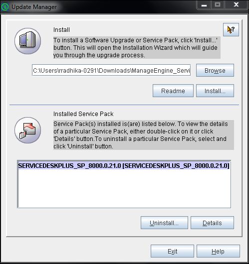 要在控制台模式下运行 UPDATEMANGER.bat:UpdateManager.sh -c -option i ppmPath <PPM 下载路径> -h C:\ManageEngine\ServiceDesk