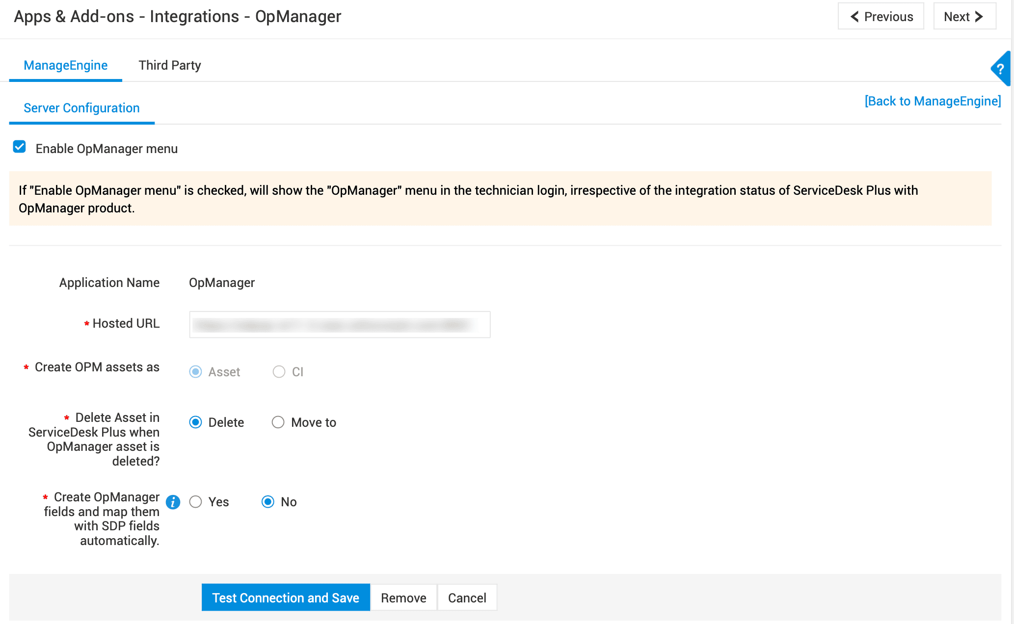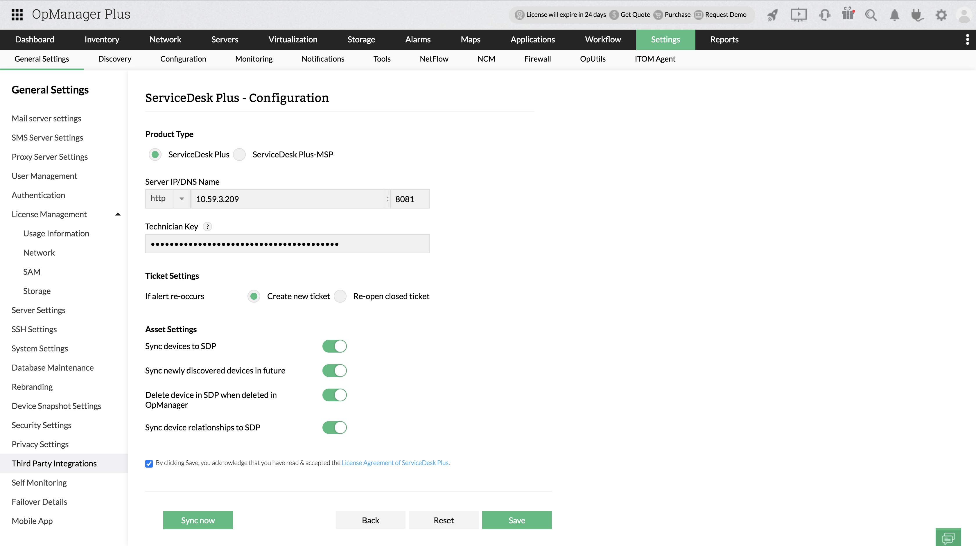 如果上述字段中的设备详细信息被更新,或者设备在 OpManager 中被删除,相同的变更也会反映在 ServiceDesk Plus 中。