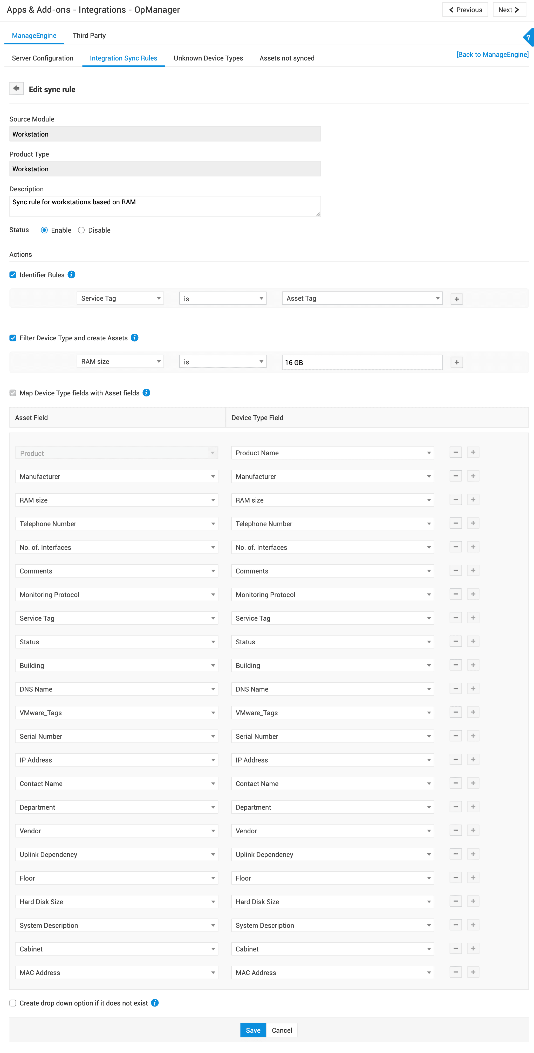 集成同步规则使您能够将 OpManager 中的设备自动同步为 ServiceDesk Plus 中的资产或 CI。