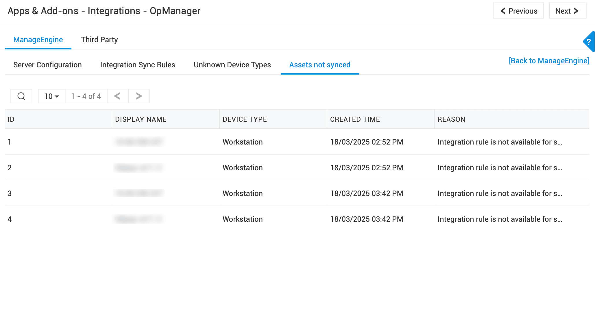 OpManager 根据已配置的同步规则同步设备。如果某个设备未被同步,其详细信息以及失败原因会记录在未同步的资产/未同步的 CI 选项卡中。