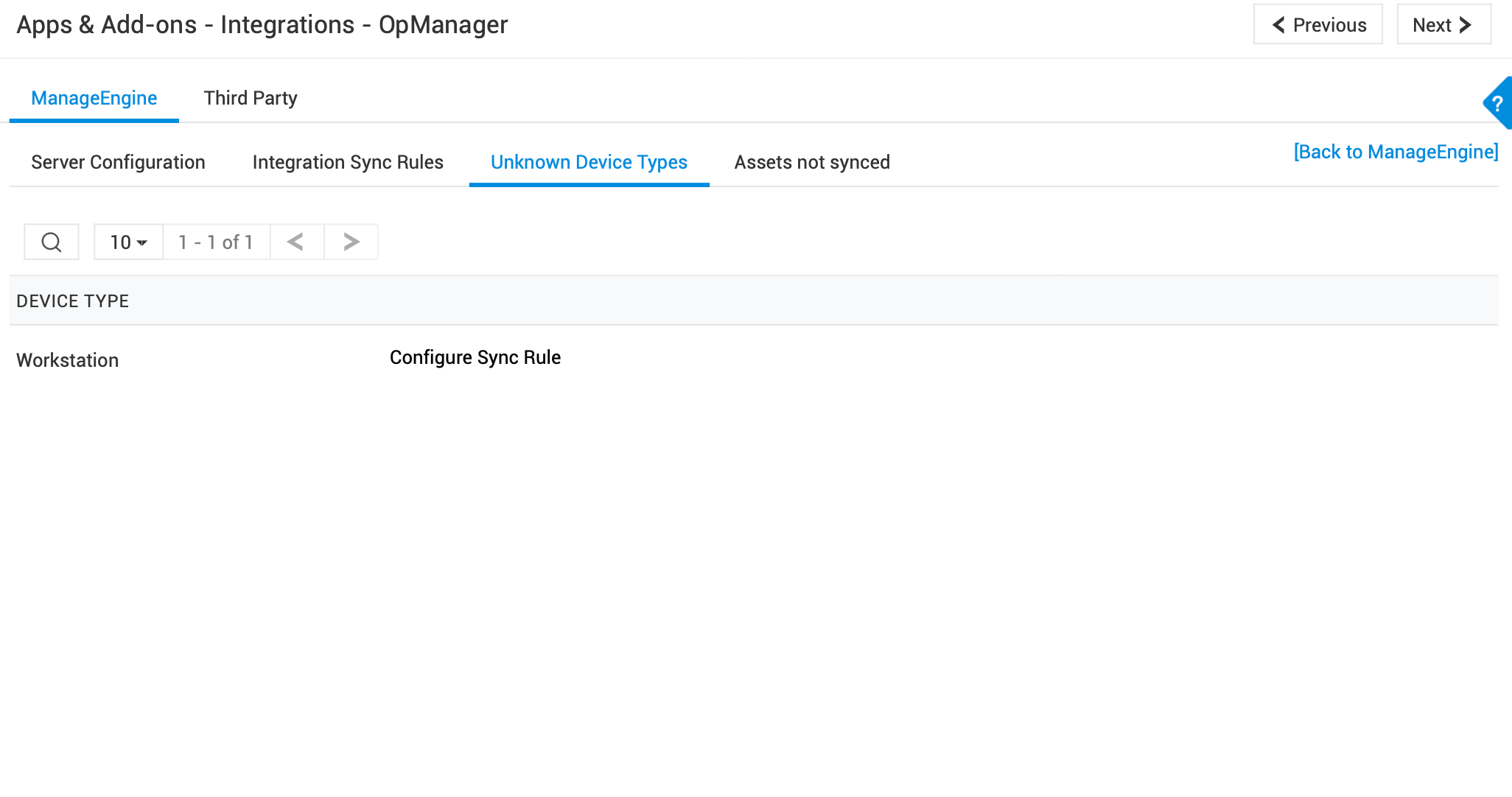 例如,如果在 OpManager 中创建了一个自定义类别移动设备,但 ServiceDesk Plus 中不存在对应的产品类型或 CI 类型,那么这些设备将列在“未知设备类型”选项卡下。