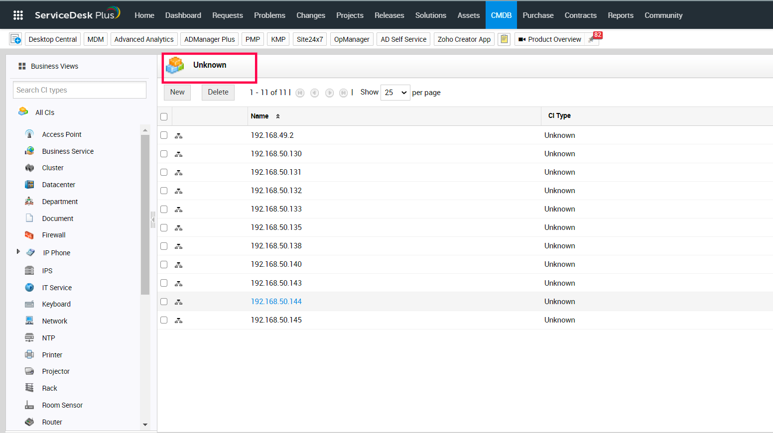 在 OpManger 中,如果 Layer2 发现期间发现的设备数量超过可用节点许可证数量,多余的设备将被归类为 未管理对象。在与 ServiceDesk Plus 进行关系同步期间,未管理对象将添加到 未知 CI 类型 下。如果未管理对象在 OpManager 中被转换为受管对象,则 ServiceDesk Plus 中相应的未知 CI 将移动到对应的 CI 类型下。
