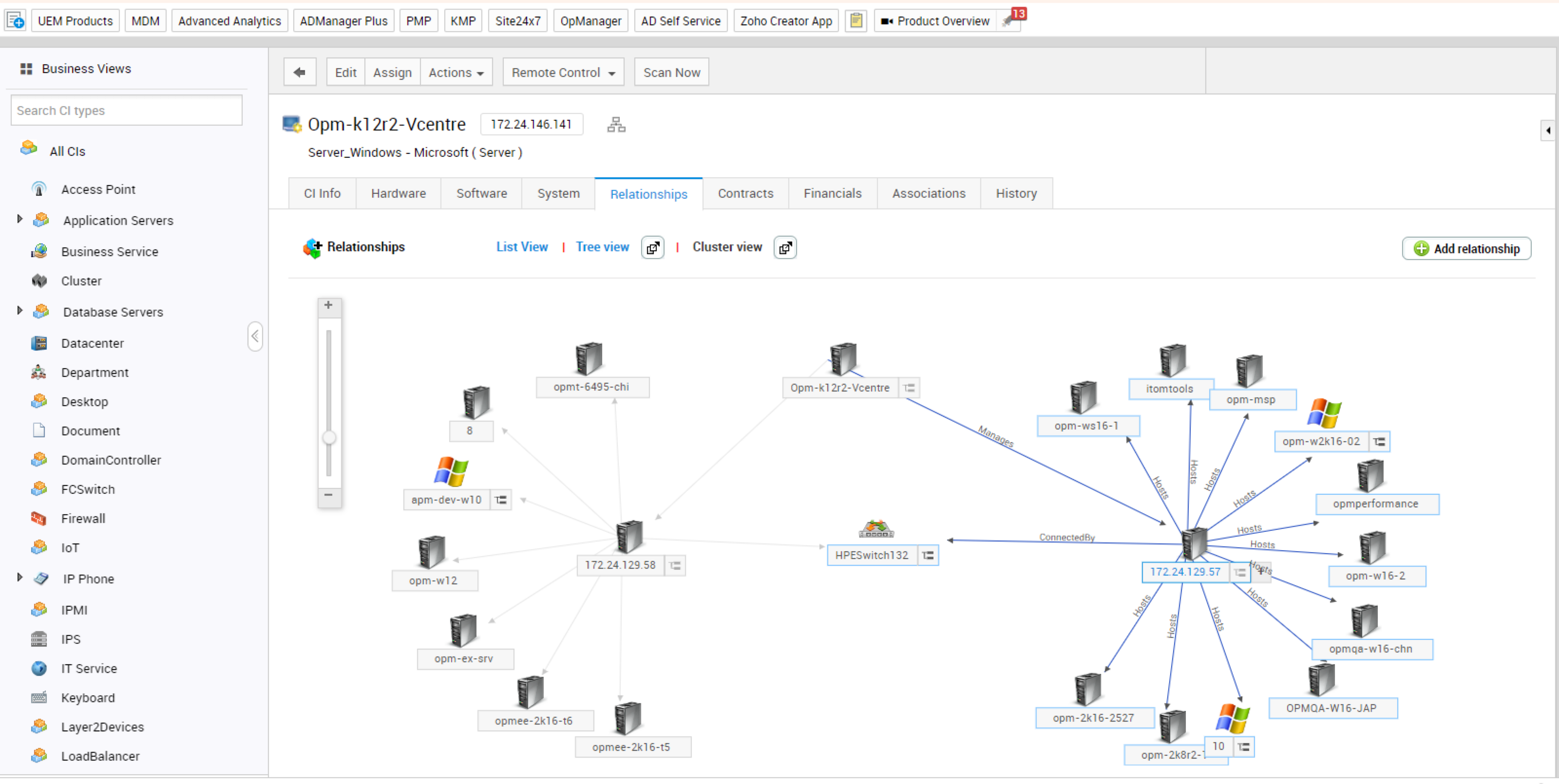 生成 Layer2 地图后,设备之间的关系(即连接和依赖详情)将同步到 ServiceDesk Plus CMDB。这使 IT 管理员能够连同 CI 之间的相互关系一起可视化 IT 基础架构。