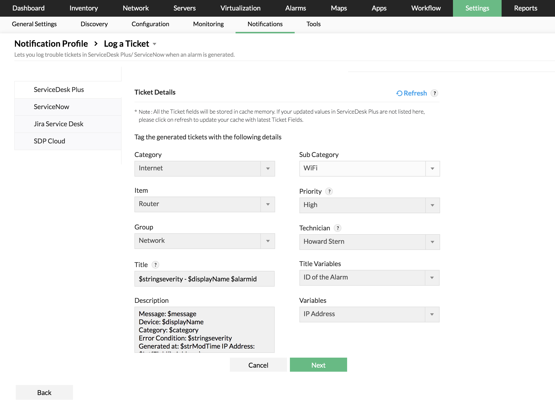 在 OpManager 中的设置 > 通知 > 通知配置文件下创建通知配置文件。您可以指定要填充到 ServiceDesk Plus 中的工单详细信息。生成请求后,这些工单详细信息将自动更新到该请求中。