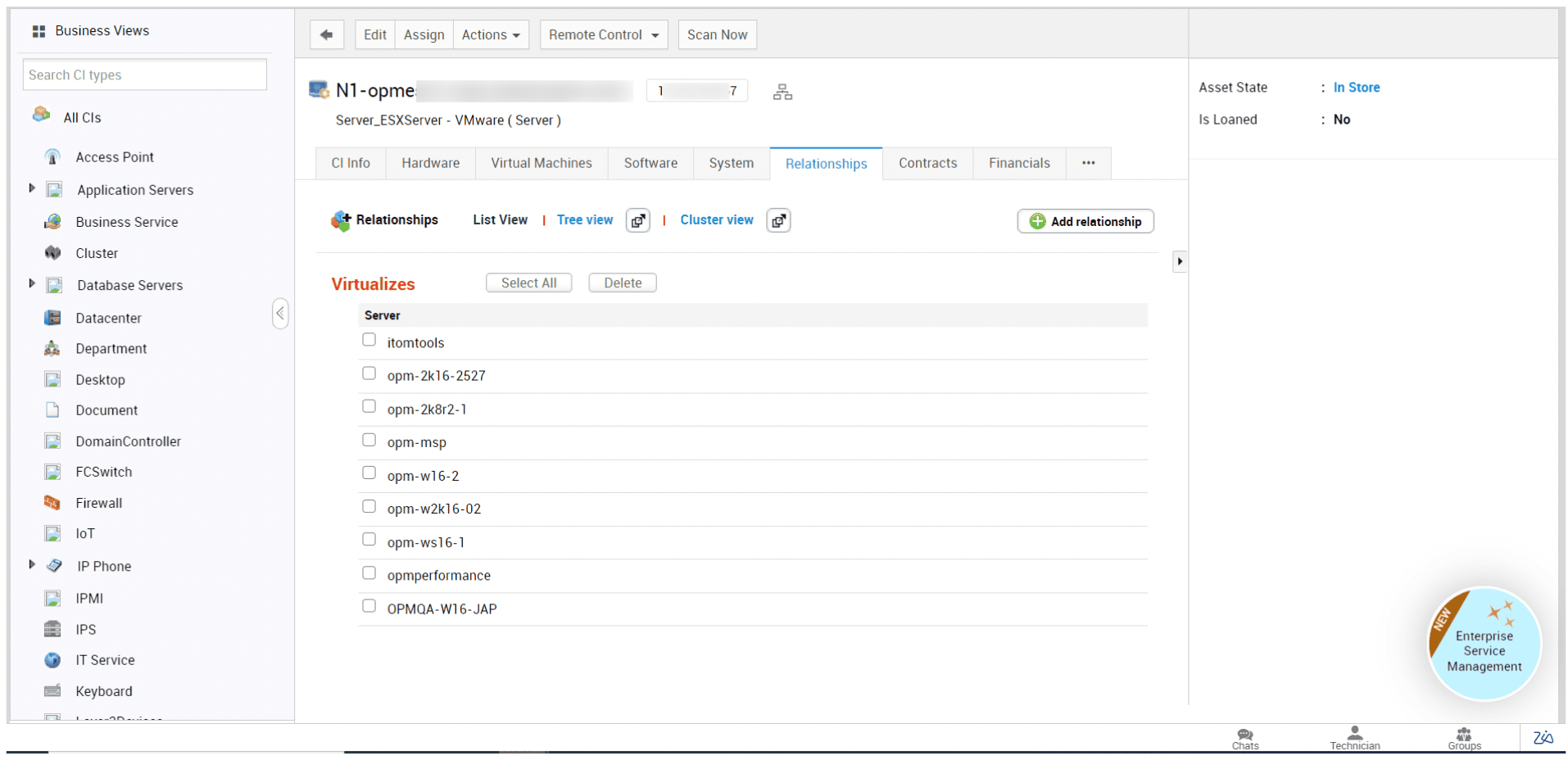 此外,在发现期间识别并由 OpManager 维护的虚拟设备层级结构也会同步到 ServiceDesk Plus CMDB。技术人员可以在相应 CI 详情页面的 关系 选项卡下访问已同步的层级结构详情。